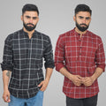Pack Of 2 Mens Black And Wine Wide Check Cotton Short Kurta Combo