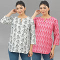 Discover the ideal combination of style and comfort with our Pack Of 2 Womens Regular Fit Tops Combo. Embrace the essence of fashion with appealing floral, tribal, vector, and zigzag prints that bring a splash of excitement to your outfit. These tops are made of quality cotton and are breathable and cosy all day. The round neck with a V-cut enhances your neckline, giving you a sleek and modern look. Elevate your fashion quotient easy with these adaptable short kurti tops that move from casual outings to semi formal occasions. Shop now to update your look with the latest fashion trends for women!
