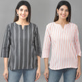 Our Set of Two Striped Cotton Women Tops Combo offers unmatched comfort and style. For stylish ladies who value both cost and quality, these contemporary tops are ideal. These tops, which are made of soft and lightweight cotton, have a timeless striped pattern that elevates any outfit. These tops are adaptable for any occasion with a flattering fit and a robust design. With this essential set, you can up your style ante while maintaining comfort. Get our Striped Cotton Women Tops Combo today to stand out From The Crowd.