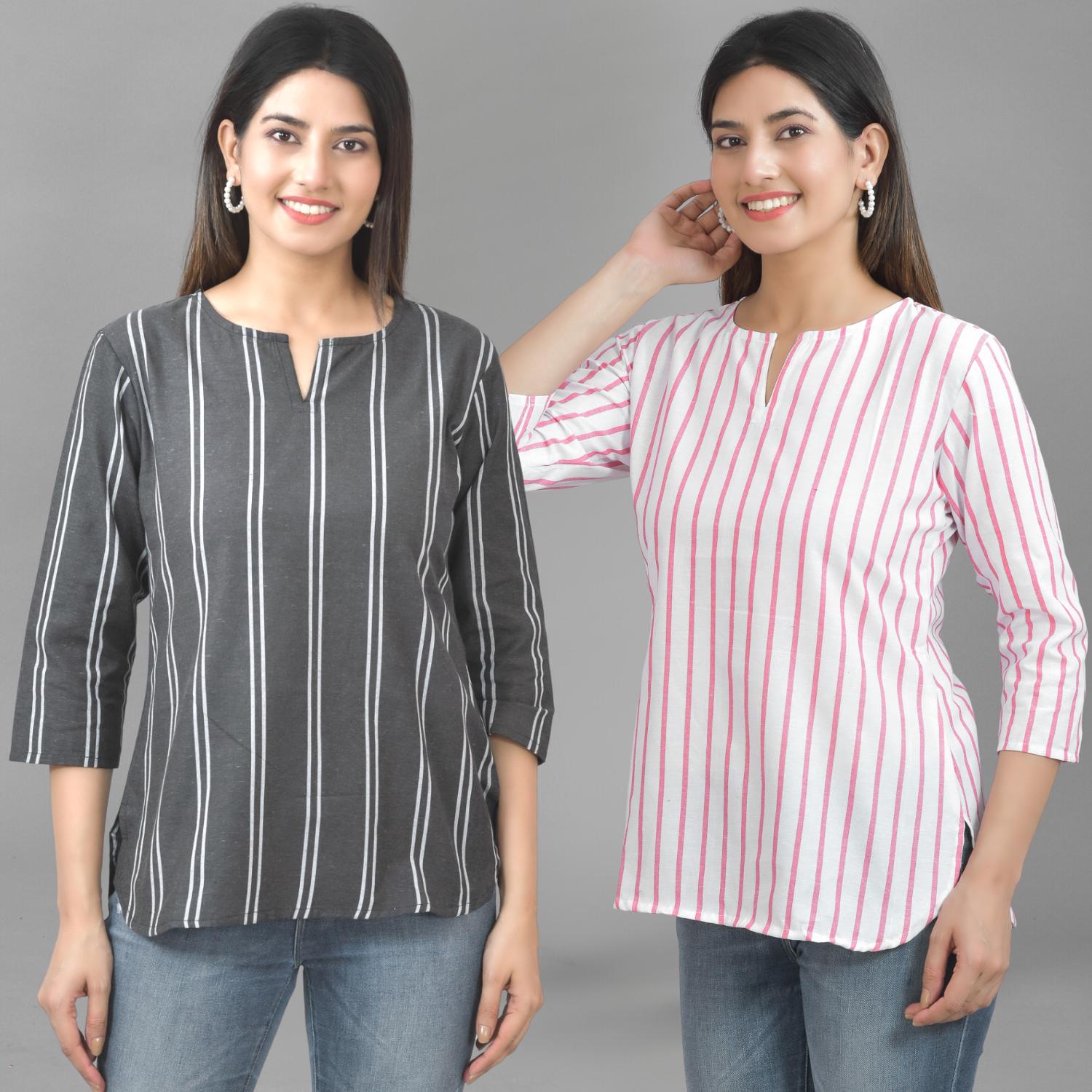 Our Set of Two Striped Cotton Women Tops Combo offers unmatched comfort and style. For stylish ladies who value both cost and quality, these contemporary tops are ideal. These tops, which are made of soft and lightweight cotton, have a timeless striped pattern that elevates any outfit. These tops are adaptable for any occasion with a flattering fit and a robust design. With this essential set, you can up your style ante while maintaining comfort. Get our Striped Cotton Women Tops Combo today to stand out From The Crowd.