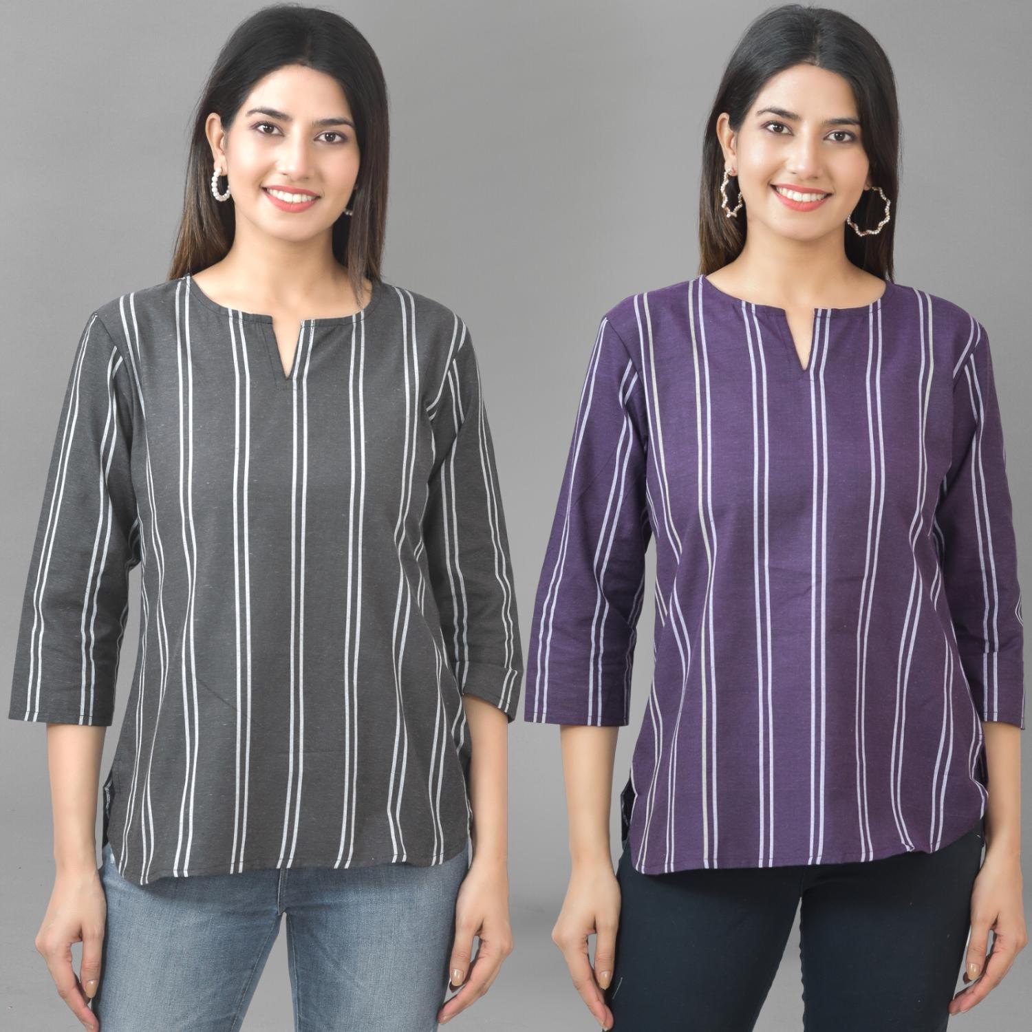 Pack Of 2 Black And Purple Striped Cotton Womens Top Combo