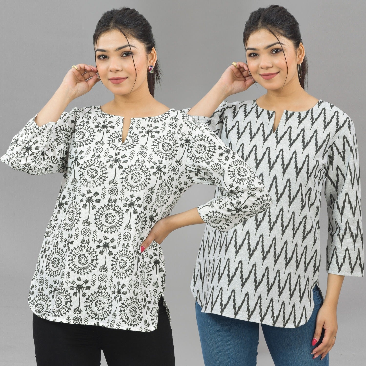 Discover the ideal combination of style and comfort with our Pack Of 2 Womens Regular Fit Tops Combo. Embrace the essence of fashion with appealing floral, tribal, vector, and zigzag prints that bring a splash of excitement to your outfit. These tops are made of quality cotton and are breathable and cosy all day. The round neck with a V-cut enhances your neckline, giving you a sleek and modern look. Elevate your fashion quotient easy with these adaptable short kurti tops that move from casual outings to semi formal occasions. Shop now to update your look with the latest fashion trends for women!