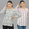 Discover the ideal combination of style and comfort with our Pack Of 2 Womens Regular Fit Tops Combo. Embrace the essence of fashion with appealing floral, tribal, vector, and zigzag prints that bring a splash of excitement to your outfit. These tops are made of quality cotton and are breathable and cosy all day. The round neck with a V-cut enhances your neckline, giving you a sleek and modern look. Elevate your fashion quotient easy with these adaptable short kurti tops that move from casual outings to semi formal occasions. Shop now to update your look with the latest fashion trends for women!