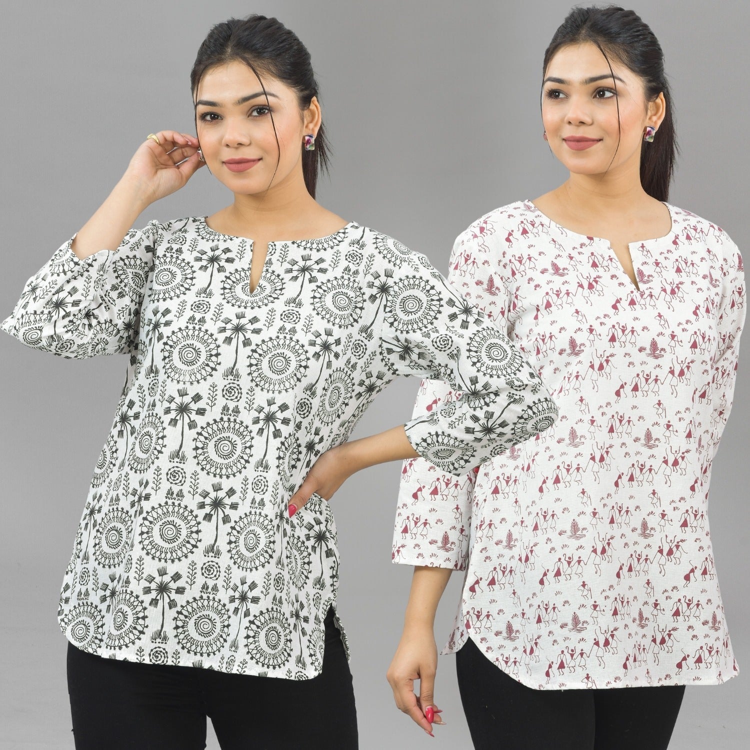 Discover the ideal combination of style and comfort with our Pack Of 2 Womens Regular Fit Tops Combo. Embrace the essence of fashion with appealing floral, tribal, vector, and zigzag prints that bring a splash of excitement to your outfit. These tops are made of quality cotton and are breathable and cosy all day. The round neck with a V-cut enhances your neckline, giving you a sleek and modern look. Elevate your fashion quotient easy with these adaptable short kurti tops that move from casual outings to semi formal occasions. Shop now to update your look with the latest fashion trends for women!