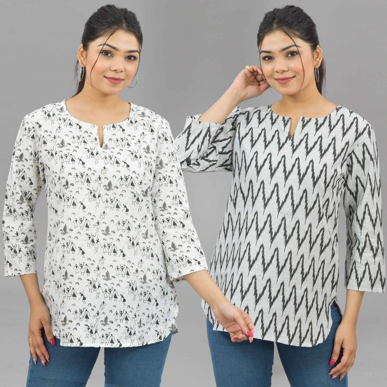 Discover the ideal combination of style and comfort with our Pack Of 2 Womens Regular Fit Short Tops Combo. Embrace the essence of fashion with appealing floral, tribal, vector, and zigzag prints that bring a splash of excitement to your outfit. These tops are made of quality cotton and are breathable and cosy all day. The round neck with a V-cut enhances your neckline, giving you a sleek and modern look. Elevate your fashion quotient easy with these adaptable short kurti tops that move from casual outings to semi formal occasions. Shop now to update your look with the latest fashion trends for women!