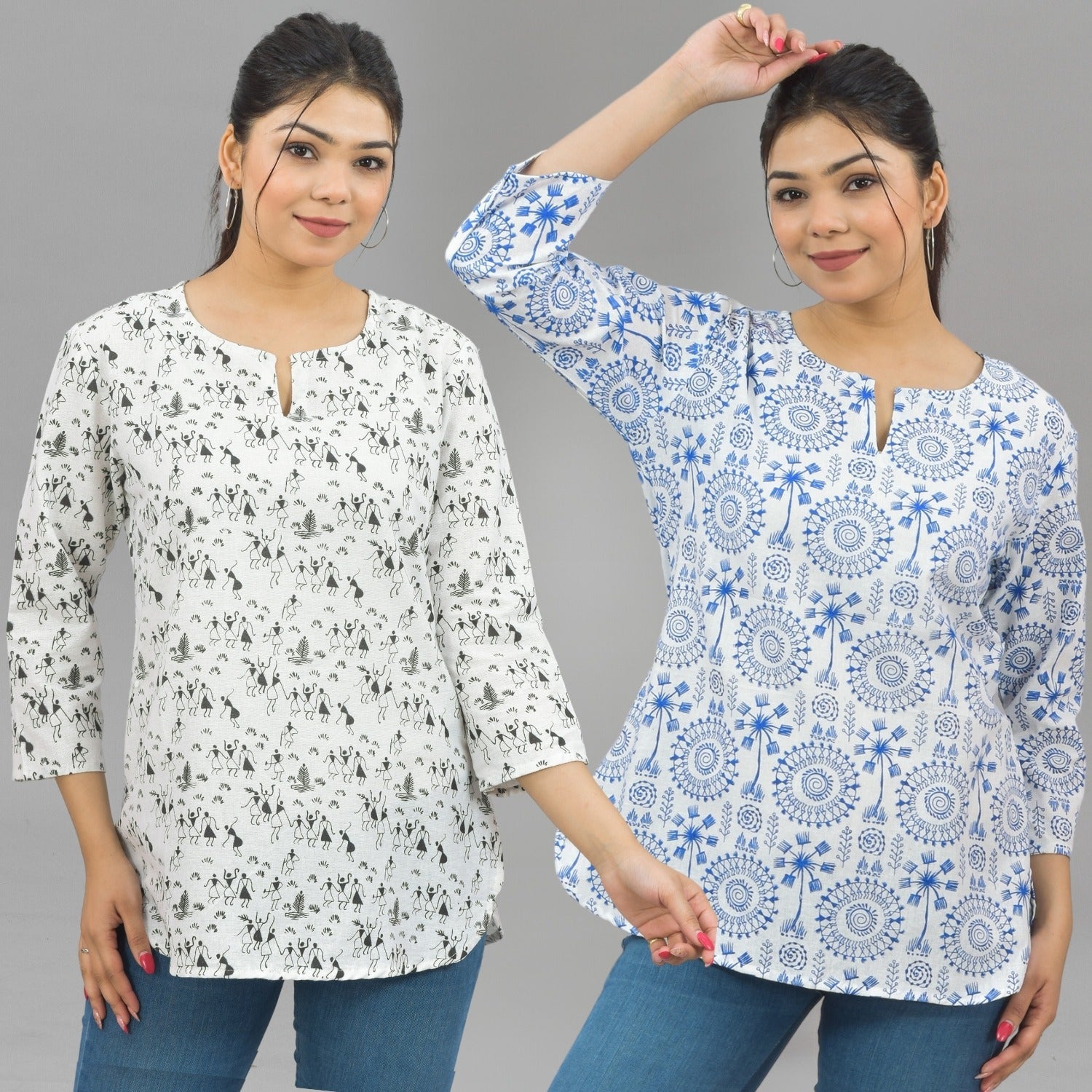 Discover the ideal combination of style and comfort with our Pack Of 2 Womens Regular Fit Short Tops Combo. Embrace the essence of fashion with appealing floral, tribal, vector, and zigzag prints that bring a splash of excitement to your outfit. These tops are made of quality cotton and are breathable and cosy all day. The round neck with a V-cut enhances your neckline, giving you a sleek and modern look. Elevate your fashion quotient easy with these adaptable short kurti tops that move from casual outings to semi formal occasions. Shop now to update your look with the latest fashion trends for women!
