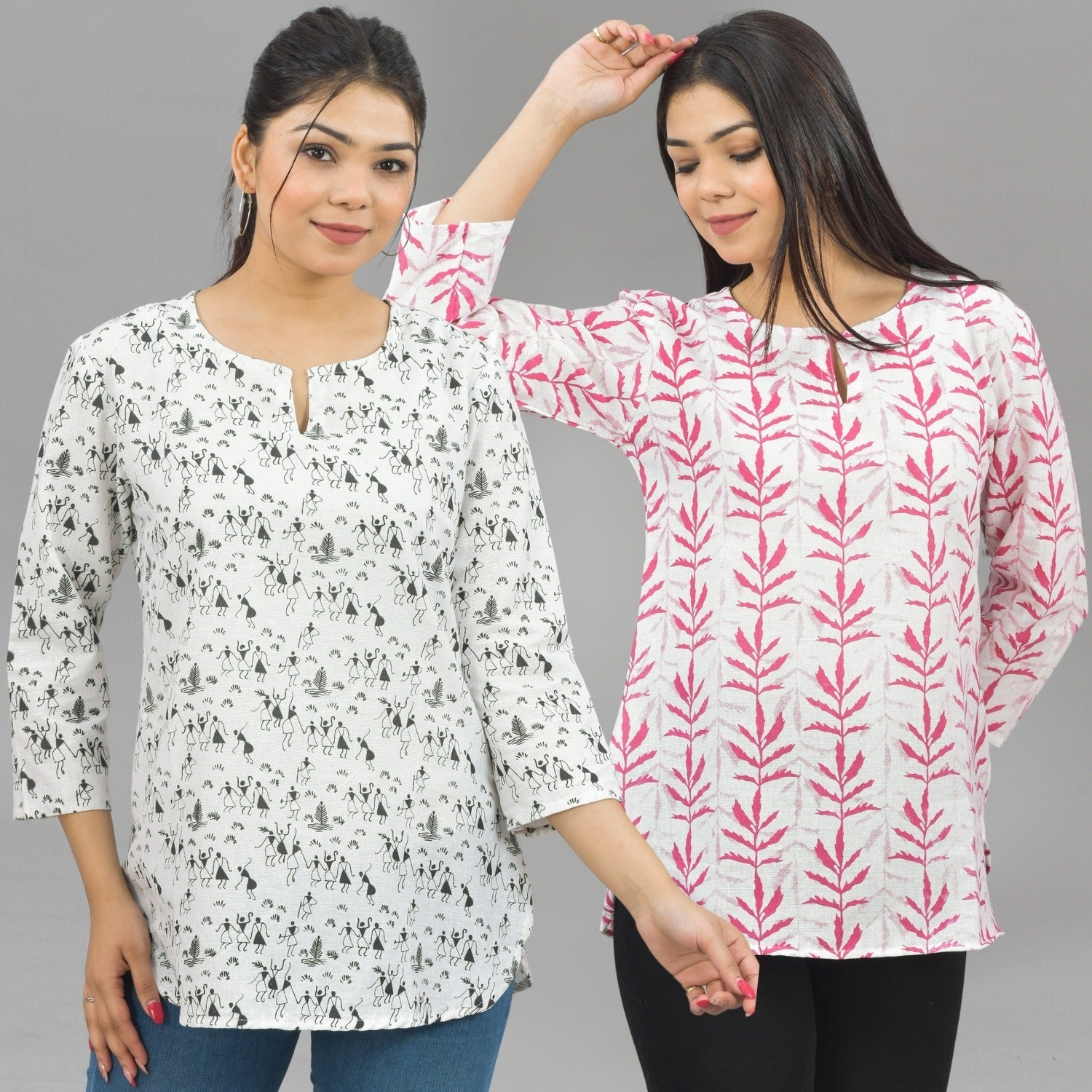 Discover the ideal combination of style and comfort with our Pack Of 2 Womens Regular Fit Short Tops Combo. Embrace the essence of fashion with appealing floral, tribal, vector, and zigzag prints that bring a splash of excitement to your outfit. These tops are made of quality cotton and are breathable and cosy all day. The round neck with a V-cut enhances your neckline, giving you a sleek and modern look. Elevate your fashion quotient easy with these adaptable short kurti tops that move from casual outings to semi formal occasions. Shop now to update your look with the latest fashion trends for women!