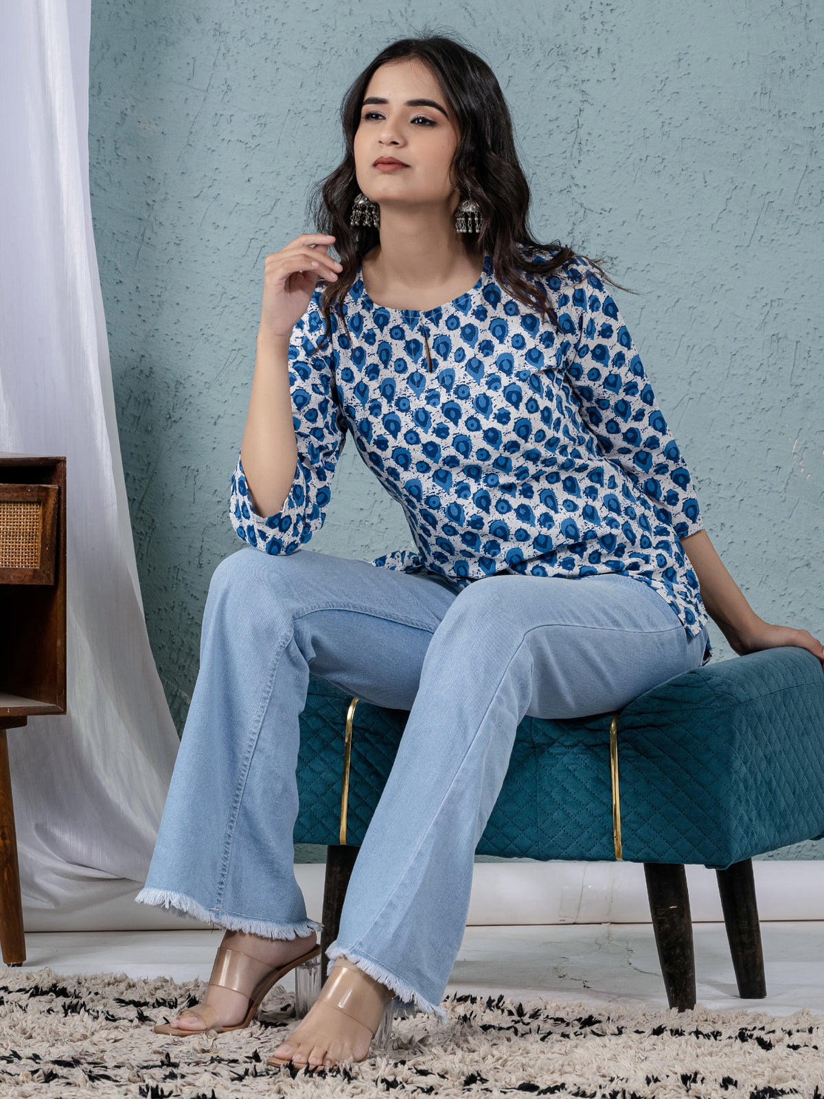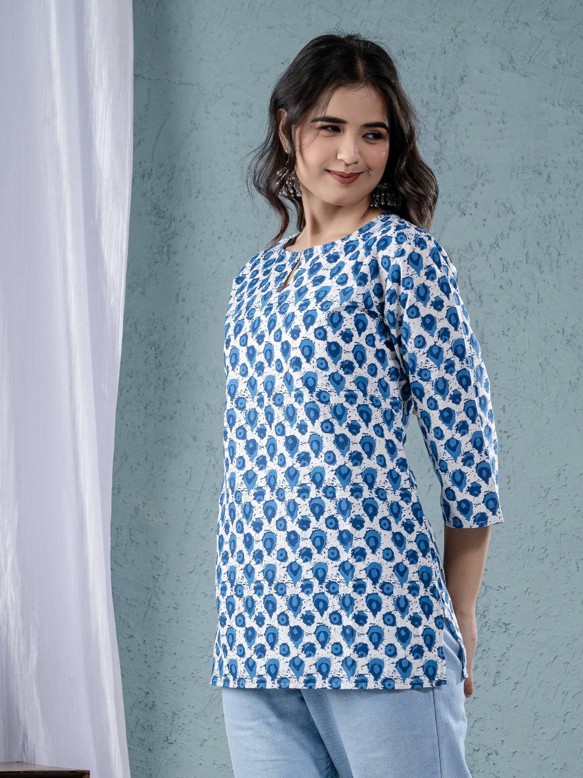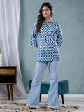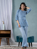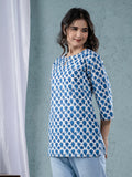 Womens Blue Sanganeri Printed Cotton Short Kurti