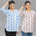 Discover the ideal combination of style and comfort with our Pack Of 2 Womens Regular Fit Short Tops Combo. Embrace the essence of fashion with appealing floral, tribal, vector, and zigzag prints that bring a splash of excitement to your outfit. These tops are made of quality cotton and are breathable and cosy all day. The round neck with a V-cut enhances your neckline, giving you a sleek and modern look. Elevate your fashion quotient easy with these adaptable short kurti tops that move from casual outings to semi formal occasions. Shop now to update your look with the latest fashion trends for women!