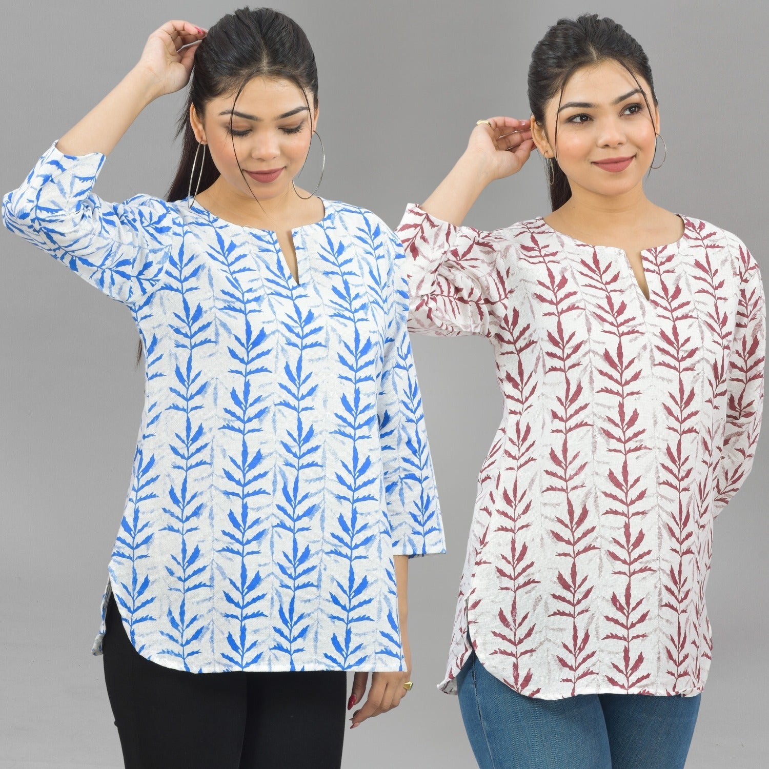 Pack Of 2 Womens Regular Fit Blue Leaf And Maroon Leaf Printed Tops Combo
