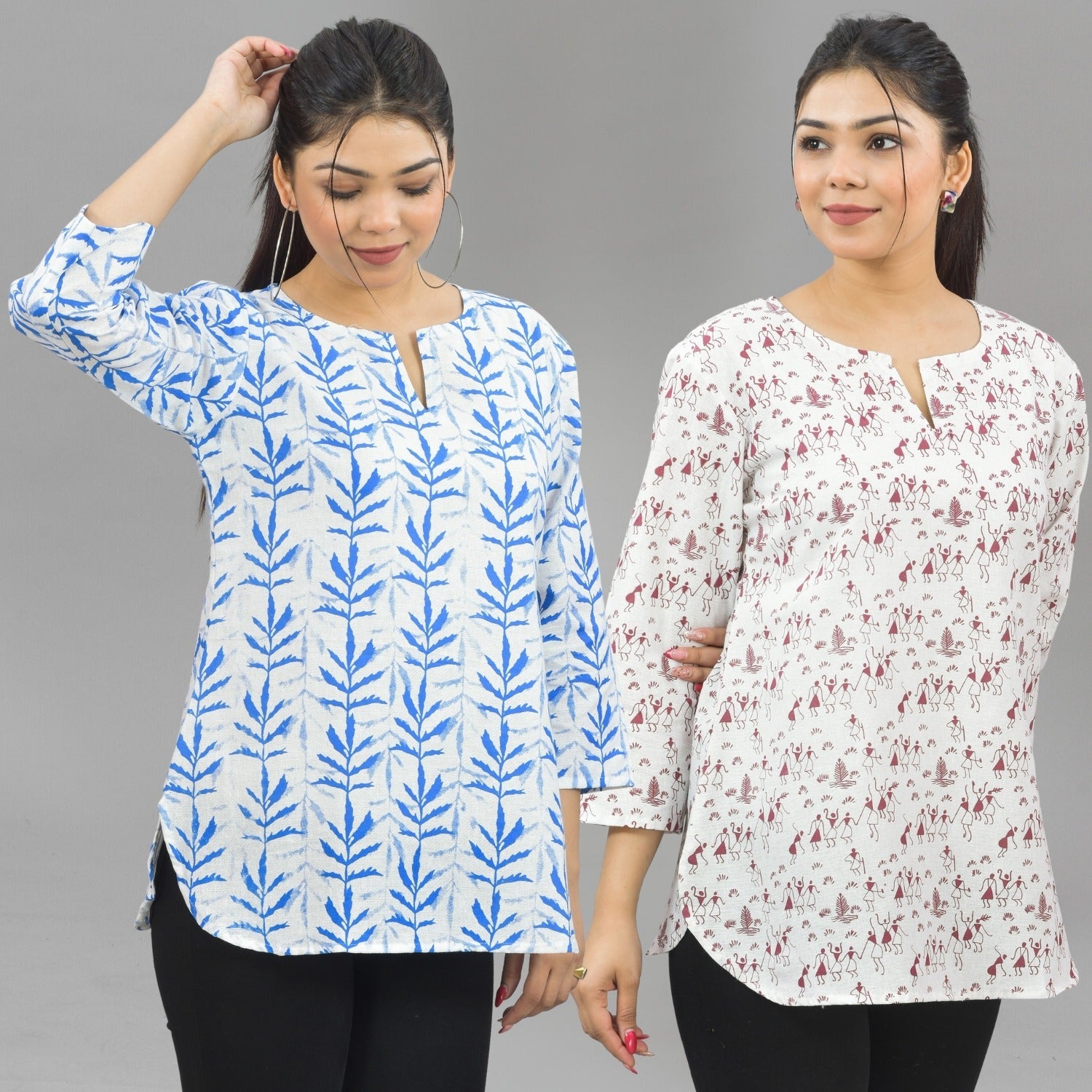 Discover the ideal combination of style and comfort with our Pack Of 2 Womens Regular Fit Short Tops Combo. Embrace the essence of fashion with appealing floral, tribal, vector, and zigzag prints that bring a splash of excitement to your outfit. These tops are made of quality cotton and are breathable and cosy all day. The round neck with a V-cut enhances your neckline, giving you a sleek and modern look. Elevate your fashion quotient easy with these adaptable short kurti tops that move from casual outings to semi formal occasions. Shop now to update your look with the latest fashion trends for women!