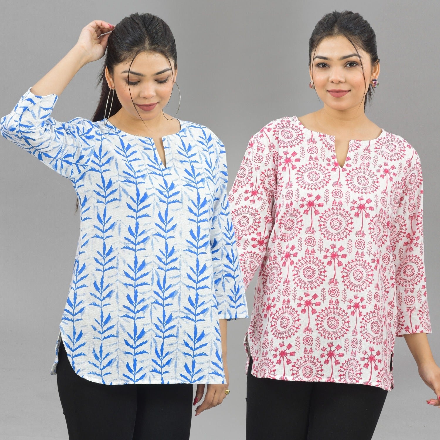 Discover the ideal combination of style and comfort with our Pack Of 2 Womens Regular Fit Short Tops Combo. Embrace the essence of fashion with appealing floral, tribal, vector, and zigzag prints that bring a splash of excitement to your outfit. These tops are made of quality cotton and are breathable and cosy all day. The round neck with a V-cut enhances your neckline, giving you a sleek and modern look. Elevate your fashion quotient easy with these adaptable short kurti tops that move from casual outings to semi formal occasions. Shop now to update your look with the latest fashion trends for women!