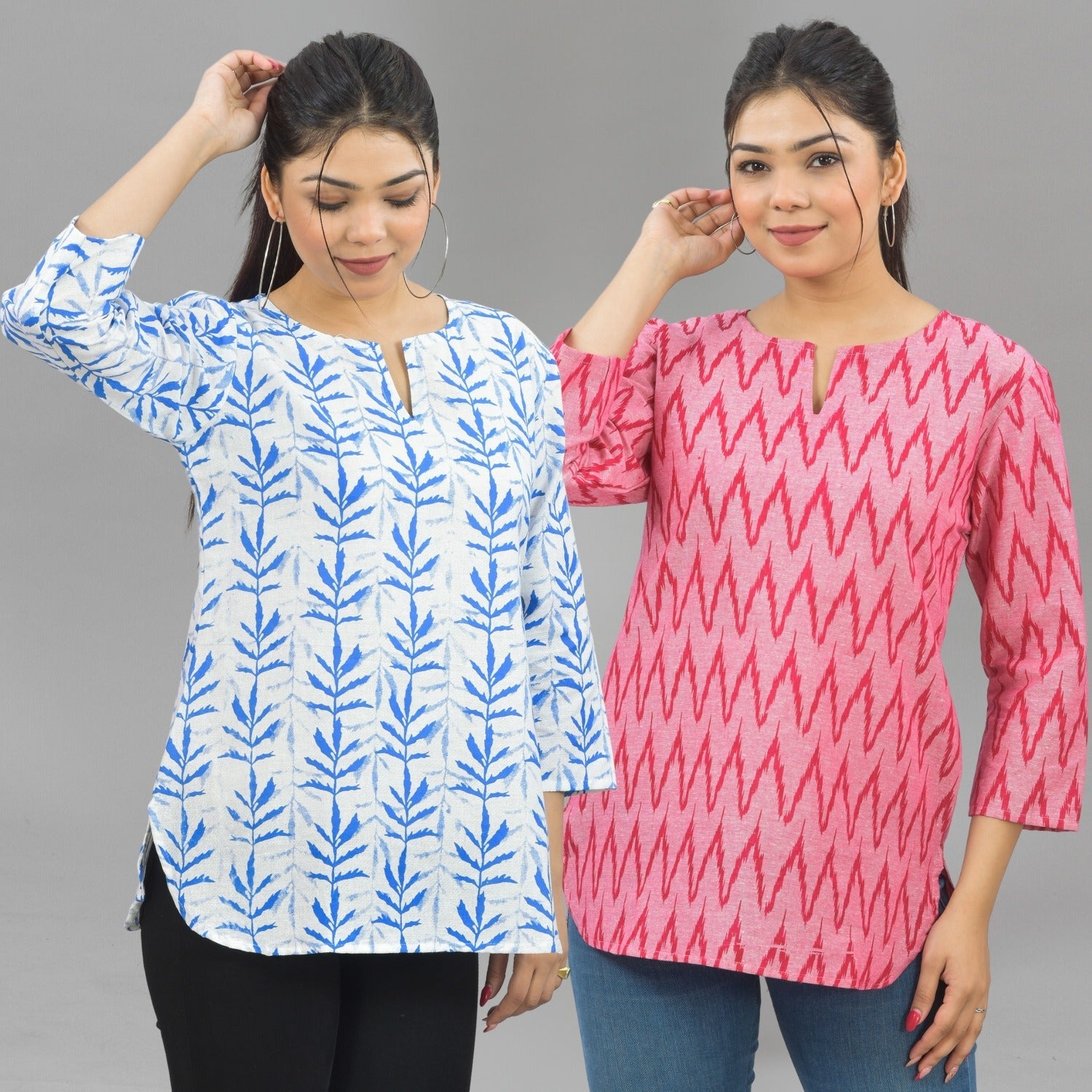 Discover the ideal combination of style and comfort with our Pack Of 2 Womens Regular Fit Short Tops Combo. Embrace the essence of fashion with appealing floral, tribal, vector, and zigzag prints that bring a splash of excitement to your outfit. These tops are made of quality cotton and are breathable and cosy all day. The round neck with a V-cut enhances your neckline, giving you a sleek and modern look. Elevate your fashion quotient easy with these adaptable short kurti tops that move from casual outings to semi formal occasions. Shop now to update your look with the latest fashion trends for women!