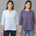 Pack Of 2 Blue And Dark Purple Striped Cotton Womens Top Combo
