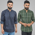 Pack Of 2 Mens Blue And Mehendi Green Wide Check Cotton Short Kurta Combo