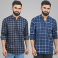 Pack Of 2 Mens Blue And Navy Blue Wide Check Cotton Short Kurta Combo