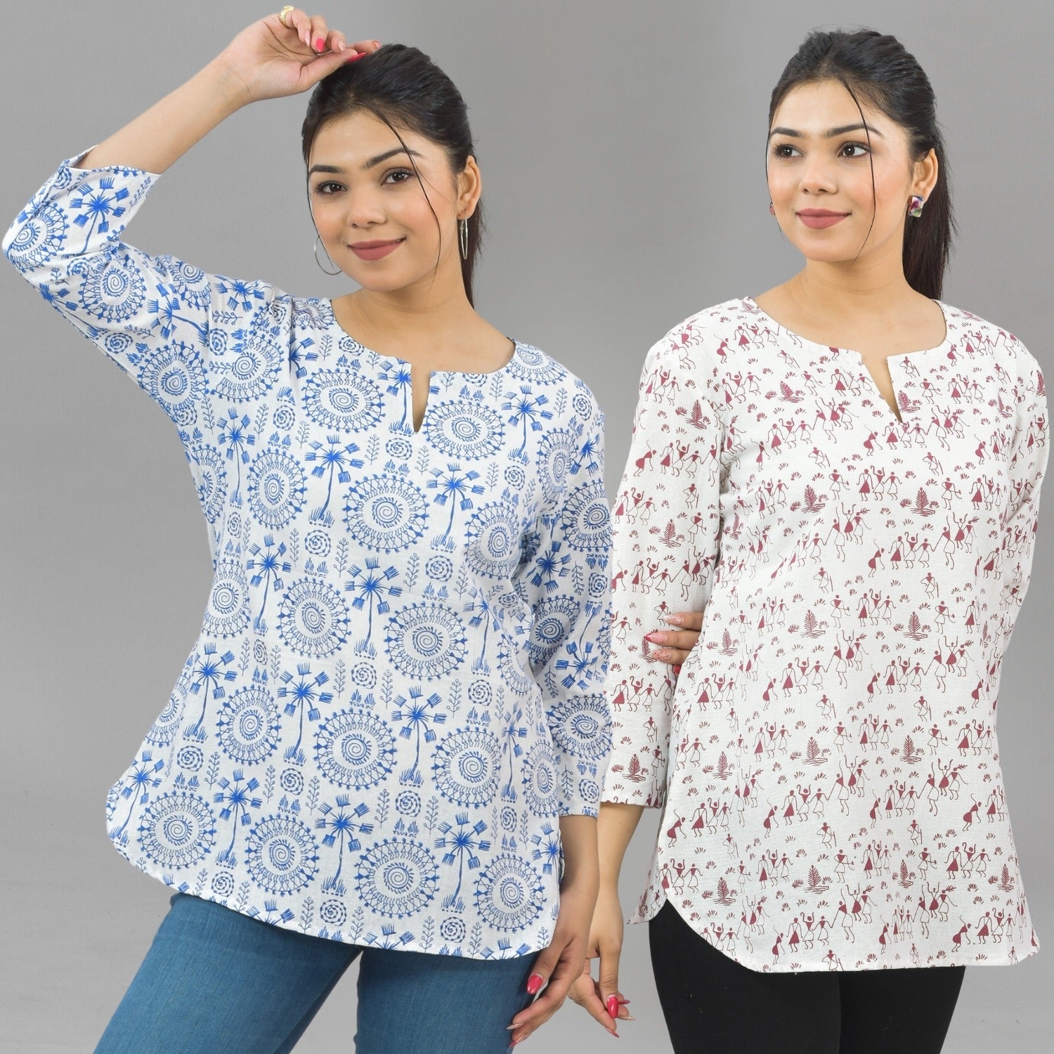 Discover the ideal combination of style and comfort with our Pack Of 2 Womens Regular Fit Short Tops Combo. Embrace the essence of fashion with appealing floral, tribal, vector, and zigzag prints that bring a splash of excitement to your outfit. These tops are made of quality cotton and are breathable and cosy all day. The round neck with a V-cut enhances your neckline, giving you a sleek and modern look. Elevate your fashion quotient easy with these adaptable short kurti tops that move from casual outings to semi formal occasions. Shop now to update your look with the latest fashion trends for women!