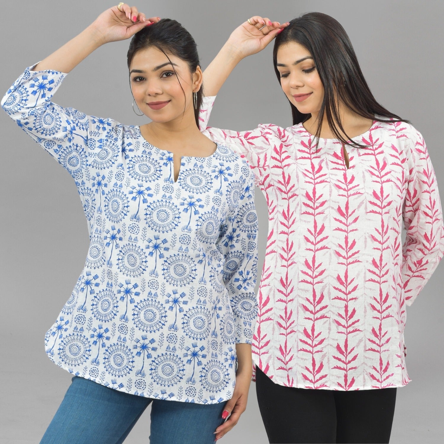 Pack Of 2 Womens Regular Fit Blue Tribal And Pink Leaf Printed Tops Combo