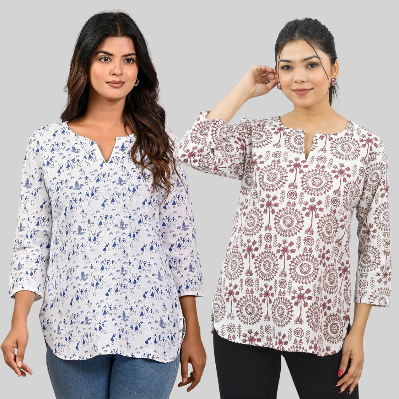 Discover the ideal combination of style and comfort with our Womens Regular Fit Short Kurti/Tops Combo. Embrace the essence of fashion with appealing floral, tribal, vector, and zigzag prints that bring a splash of excitement to your outfit. These tops are made of quality cotton and are breathable and cosy all day. The round neck with a V-cut enhances your neckline, giving you a sleek and modern look. Elevate your fashion quotient easy with these adaptable short kurti tops that move from casual outings to semi formal occasions. Shop now to update your look with the latest fashion trends for women!