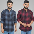 Pack Of 2 Mens Blue And Wine Check Cotton Short Kurta Combo