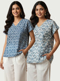 Pack Of 2 Womens Blue Zig-Zag And Light Grey Airy Linen Cotton Printed Tops
