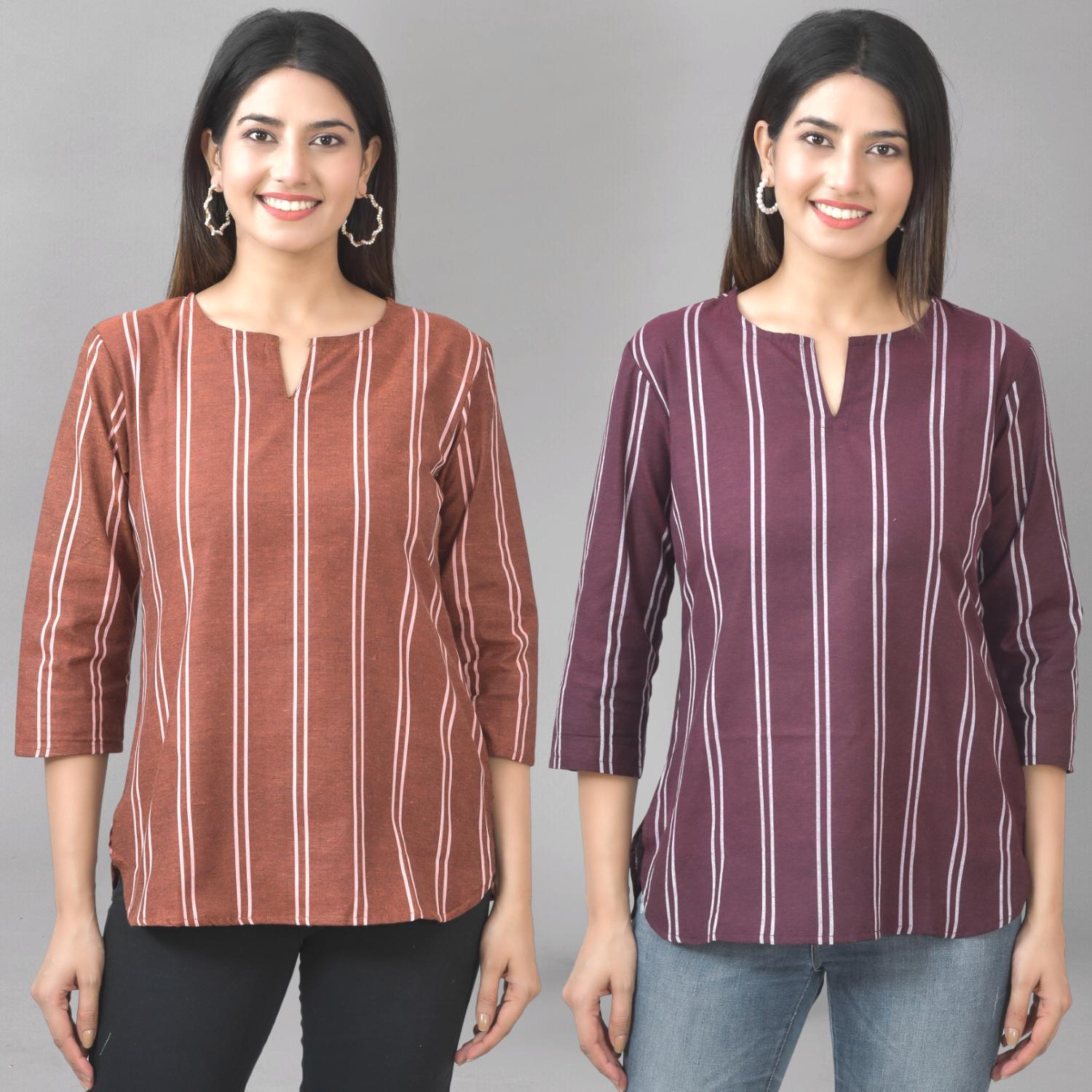 Pack Of 2 Brown And Coffee Striped Cotton Womens Top Combo
