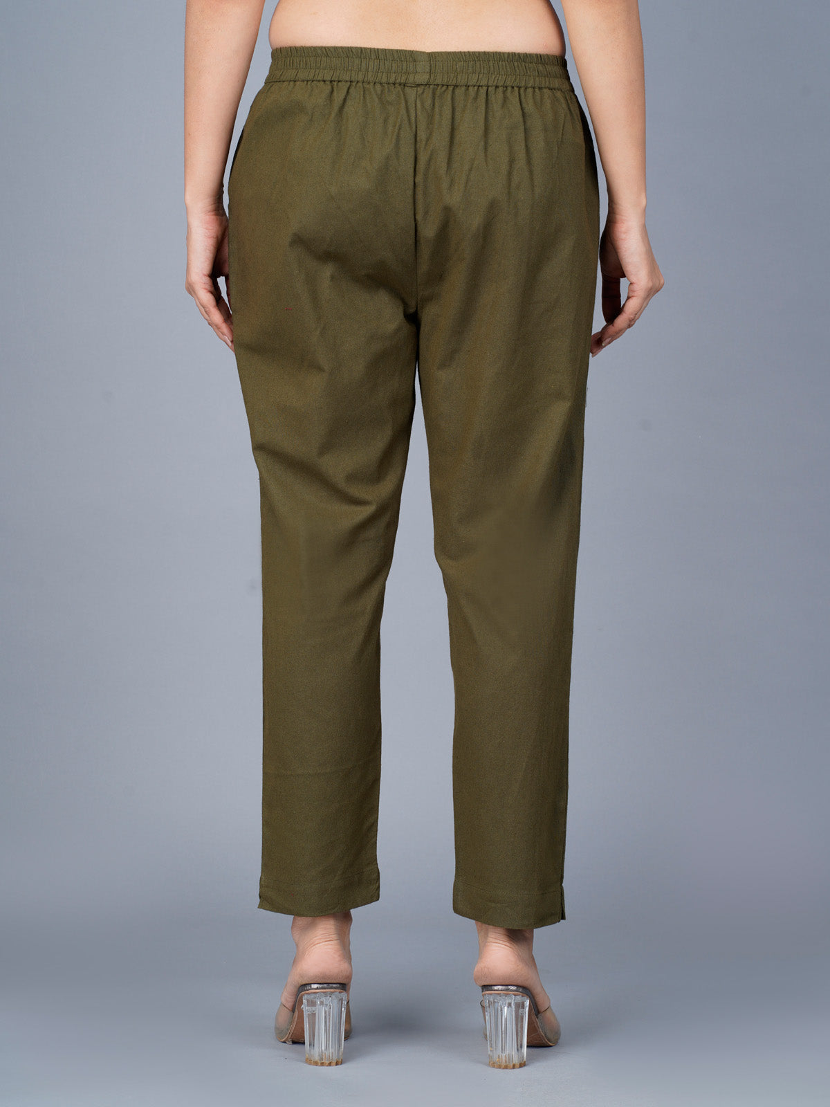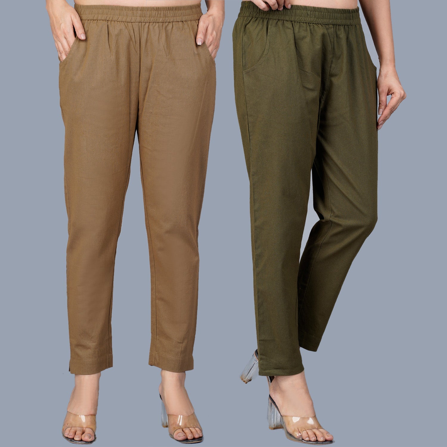 Pack Of 2 Womens Regular Fit Brown And Dark Green Fully Elastic Waistband Cotton Trouser