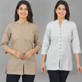 Pack Of 2 Womens Brown And Melange Grey Woven Design Handloom Cotton Frontslit Short Kurtis