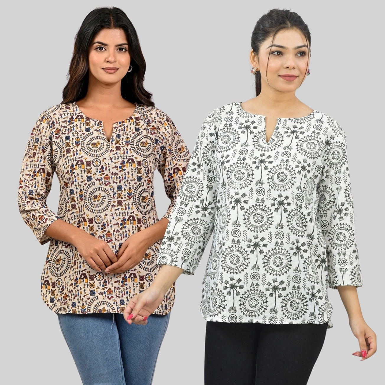 Discover the ideal combination of style and comfort with our Womens Regular Fit Short Kurti/Tops Combo. Embrace the essence of fashion with appealing floral, tribal, vector, and zigzag prints that bring a splash of excitement to your outfit. These tops are made of quality cotton and are breathable and cosy all day. The round neck with a V-cut enhances your neckline, giving you a sleek and modern look. Elevate your fashion quotient easy with these adaptable short kurti tops that move from casual outings to semi formal occasions. Shop now to update your look with the latest fashion trends for women!