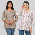 Discover the ideal combination of style and comfort with our Womens Regular Fit Short Kurti/Tops Combo. Embrace the essence of fashion with appealing floral, tribal, vector, and zigzag prints that bring a splash of excitement to your outfit. These tops are made of quality cotton and are breathable and cosy all day. The round neck with a V-cut enhances your neckline, giving you a sleek and modern look. Elevate your fashion quotient easy with these adaptable short kurti tops that move from casual outings to semi formal occasions. Shop now to update your look with the latest fashion trends for women!