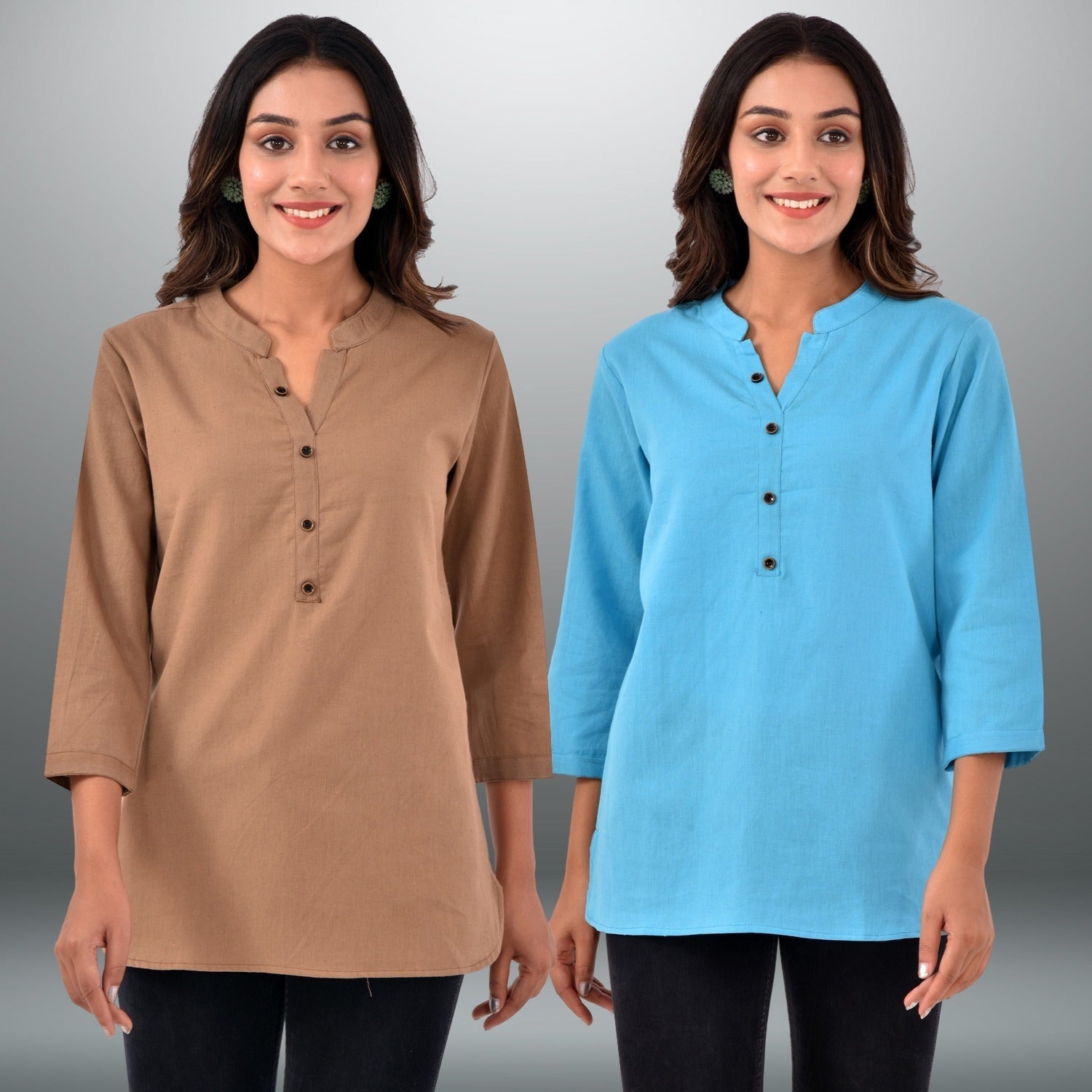 This Pack Of 2 Women's Solid Top Combo, is the ideal fusion of comfort and design, These will upgrade your wardrobe, made from a high-quality cotton that keeps you comfortable all day. Your outfit is made more sophisticated by the tasteful design. These adaptable tops is the perfect pick whether you're going to the office, on a casual trip, or to a weekend brunch. It radiates classic appeal and ups your fashion game, complete with a chinese/mandarin collar. The Women's Solid Top Combo can help you achieve modern elegance right away.