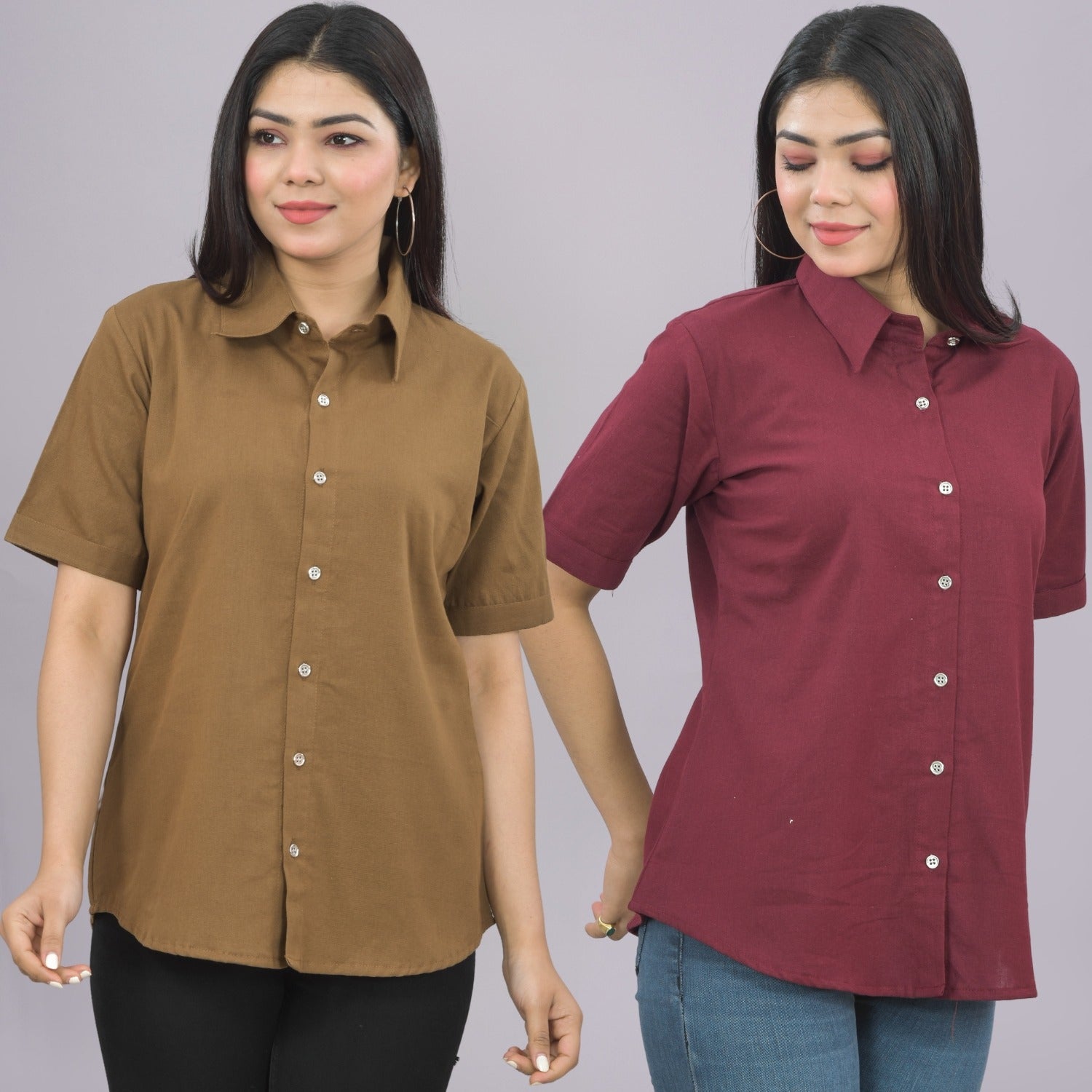 Pack Of 2 Womens Solid Brown And Wine Half Sleeve Cotton Shirts Combo
