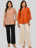 Solid Chiku And Orange V Neck Viscose Pleated Tops Combo