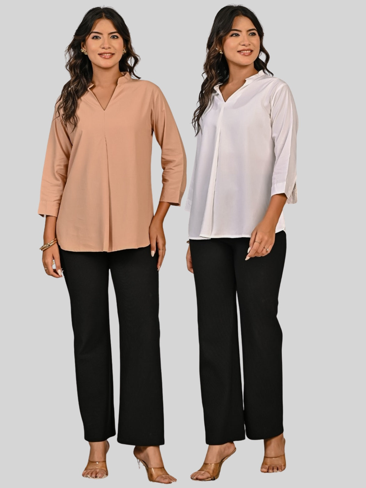 Solid Chiku And White V Neck Viscose Pleated Tops Combo