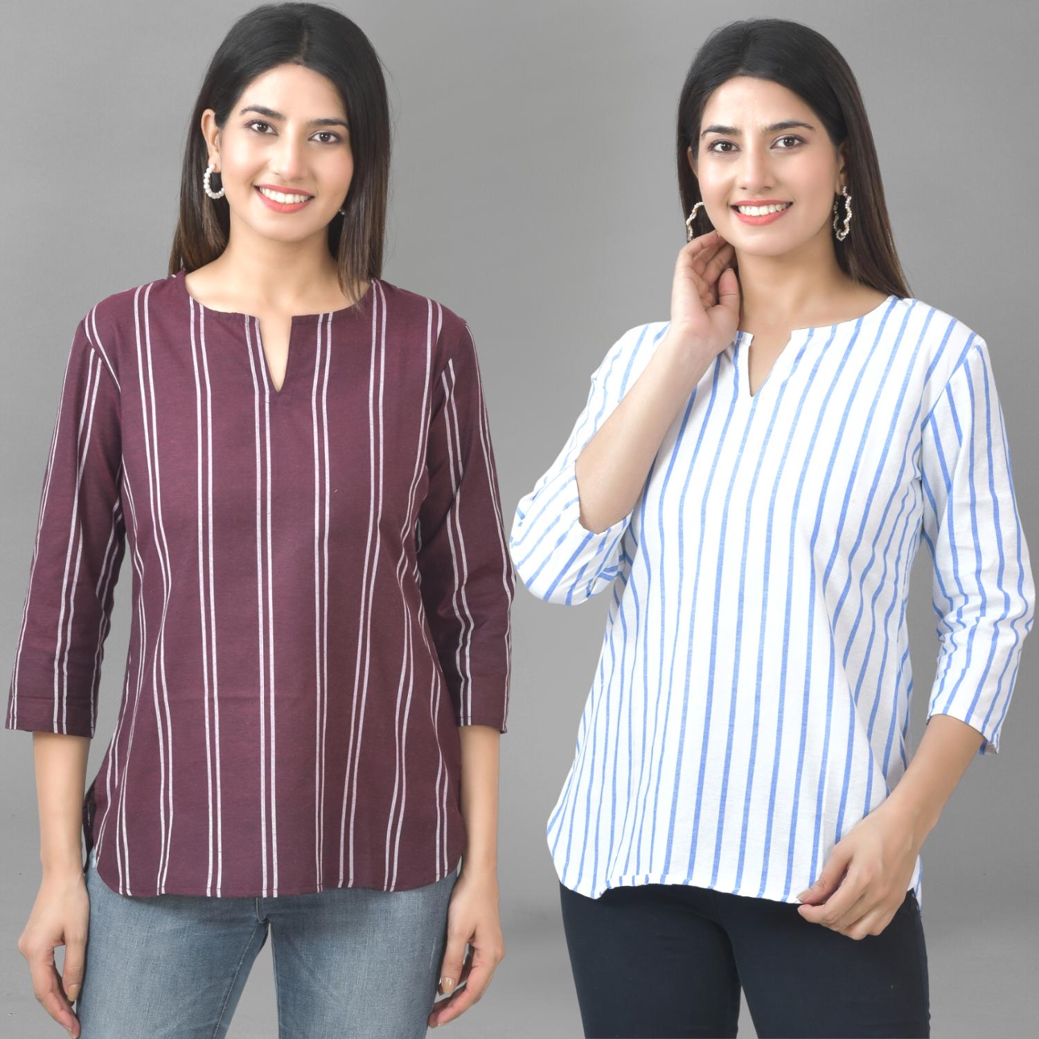 Our Set of Two Striped Cotton Women Tops Combo offers unmatched comfort and style. For stylish ladies who value both cost and quality, these contemporary tops are ideal. These tops, which are made of soft and lightweight cotton, have a timeless striped pattern that elevates any outfit. These tops are adaptable for any occasion with a flattering fit and a robust design. With this essential set, you can up your style ante while maintaining comfort. Get our Striped Cotton Women Tops Combo today to stand out From The Crowd.