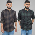 Pack Of 2 Mens Coffee And Green Check Cotton Short Kurta Combo