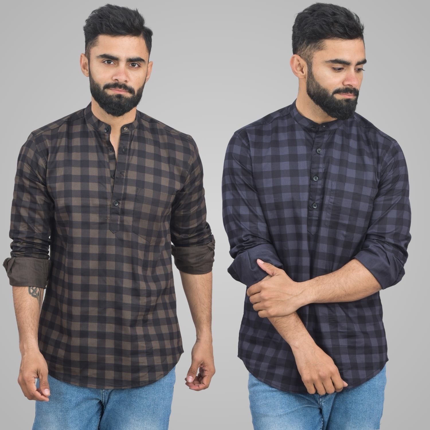 Pack Of 2 Mens Coffee And Grey Check Cotton Short Kurta Combo