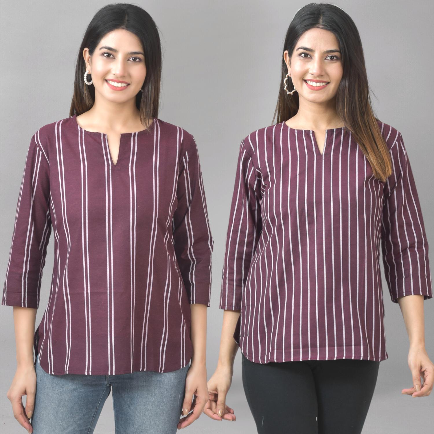 Pack Of 2 Coffee And Dark Maroon Striped Cotton Womens Top Combo