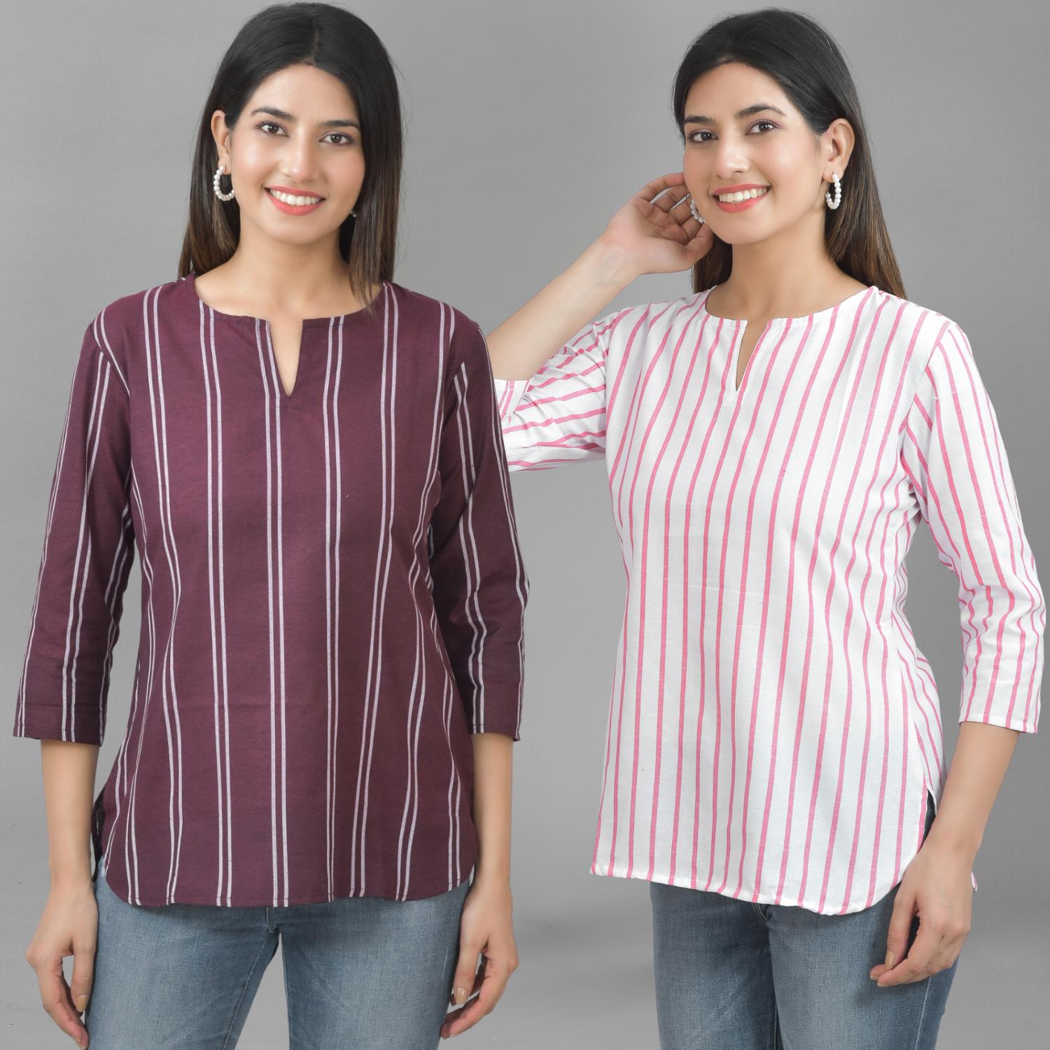 Our Set of Two Striped Cotton Women Tops Combo offers unmatched comfort and style. For stylish ladies who value both cost and quality, these contemporary tops are ideal. These tops, which are made of soft and lightweight cotton, have a timeless striped pattern that elevates any outfit. These tops are adaptable for any occasion with a flattering fit and a robust design. With this essential set, you can up your style ante while maintaining comfort. Get our Striped Cotton Women Tops Combo today to stand out From The Crowd.