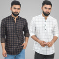 Pack Of 2 Mens Coffee And White Wide Check Cotton Short Kurta Combo