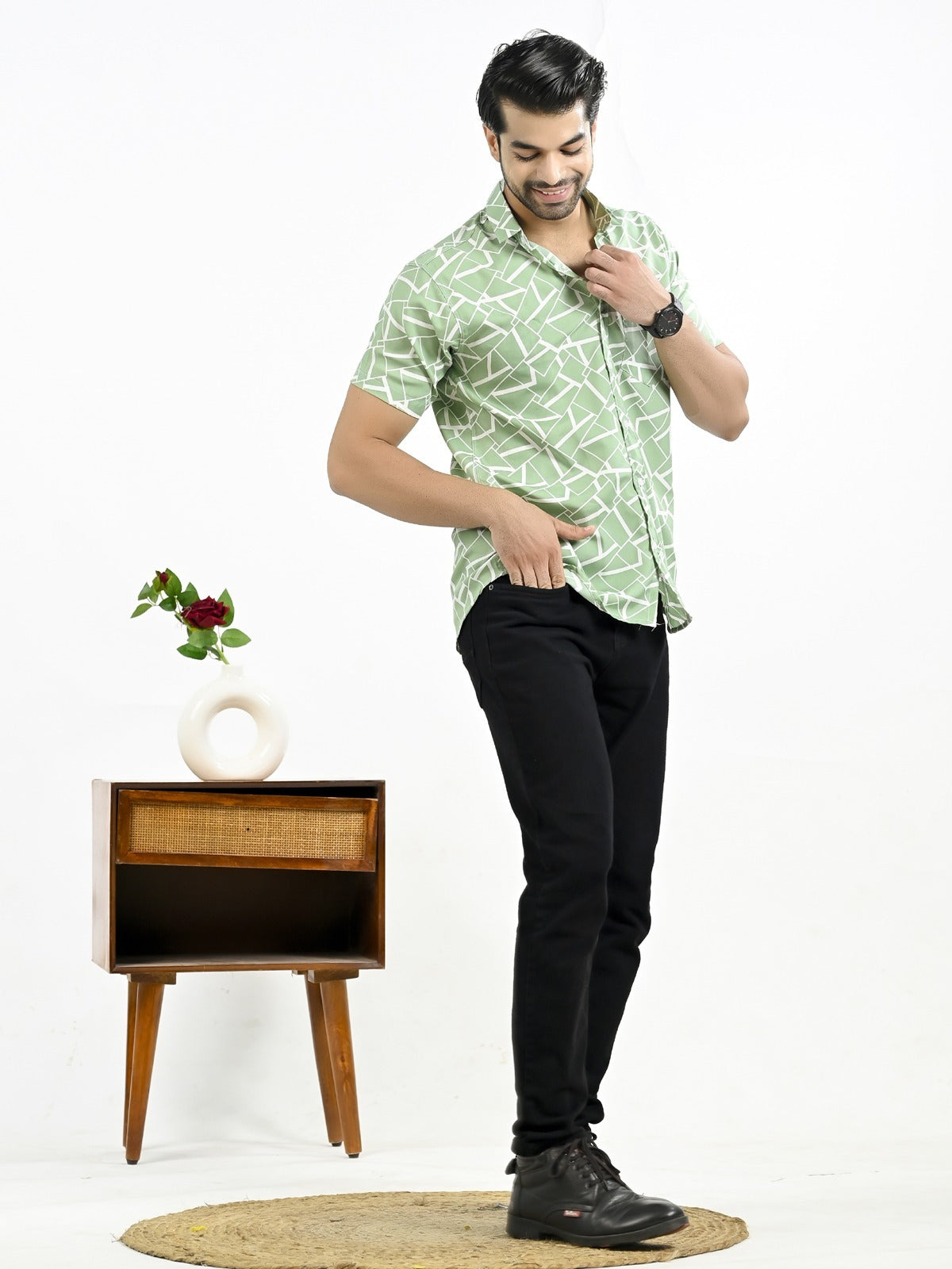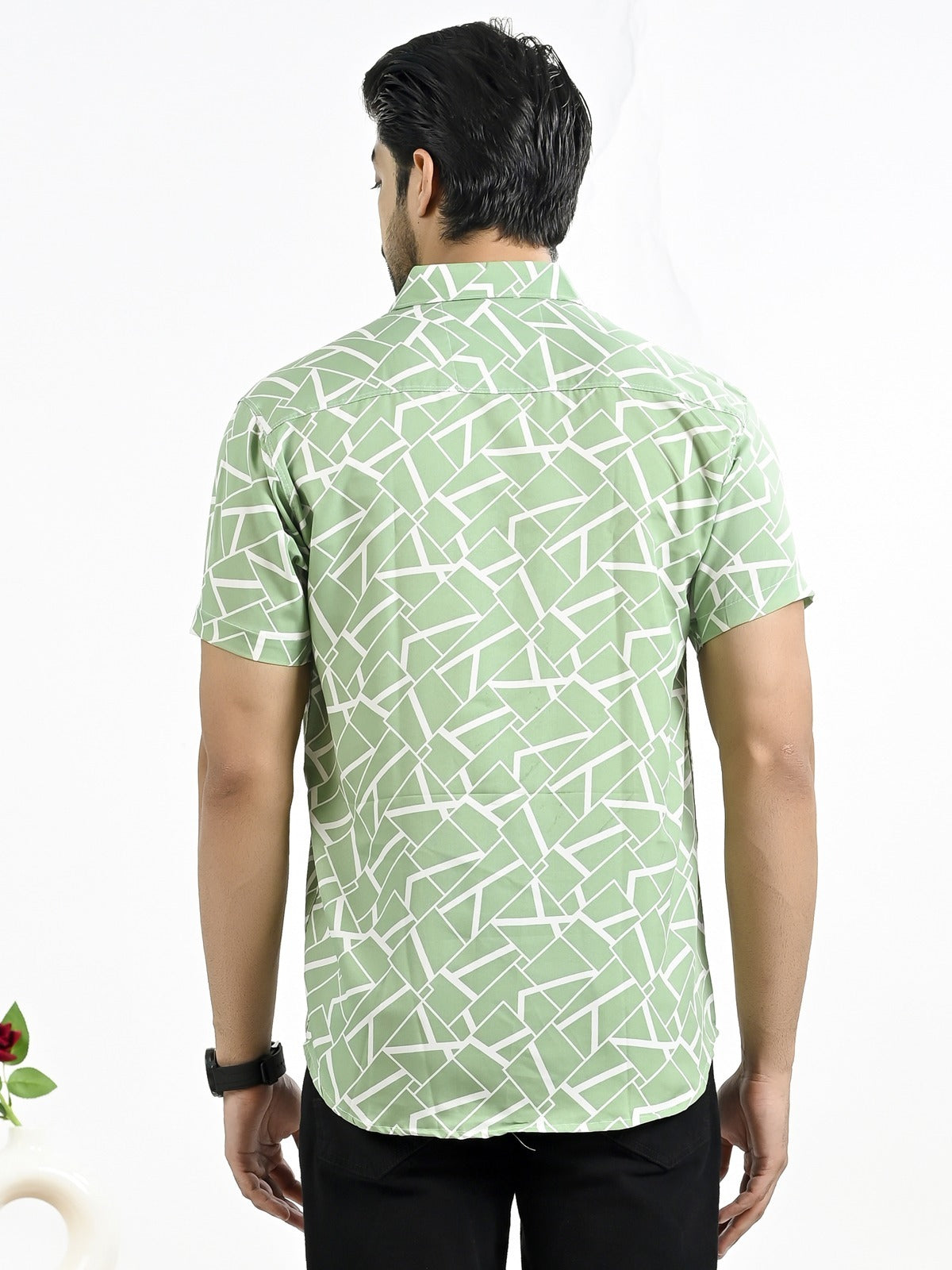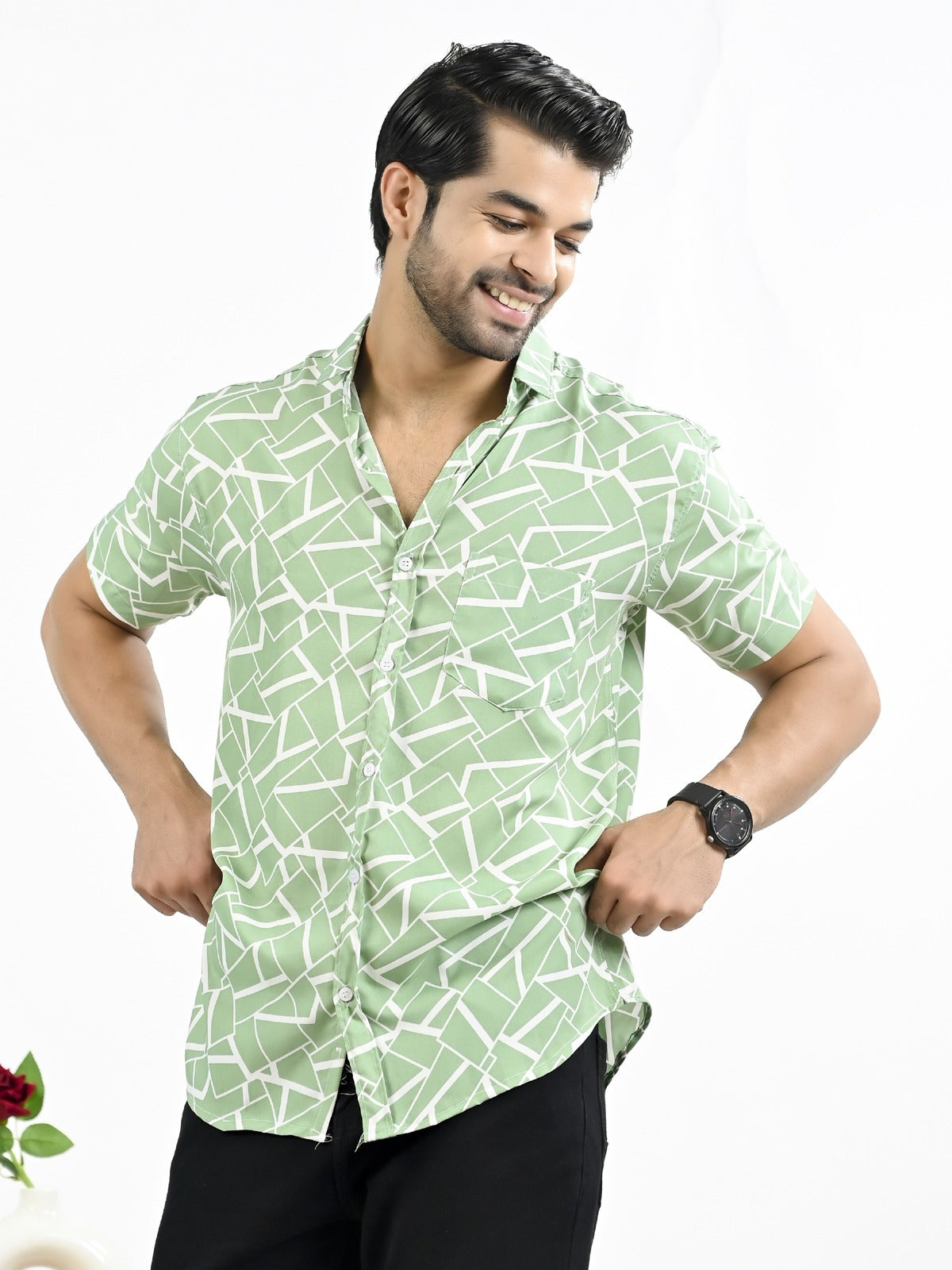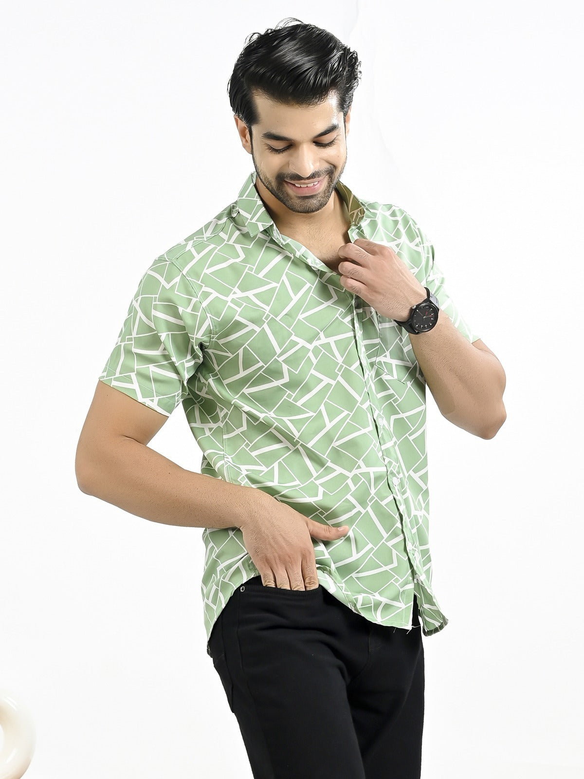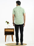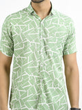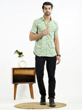 Mens Green Block Printed Half Sleeve Crepe Shirt