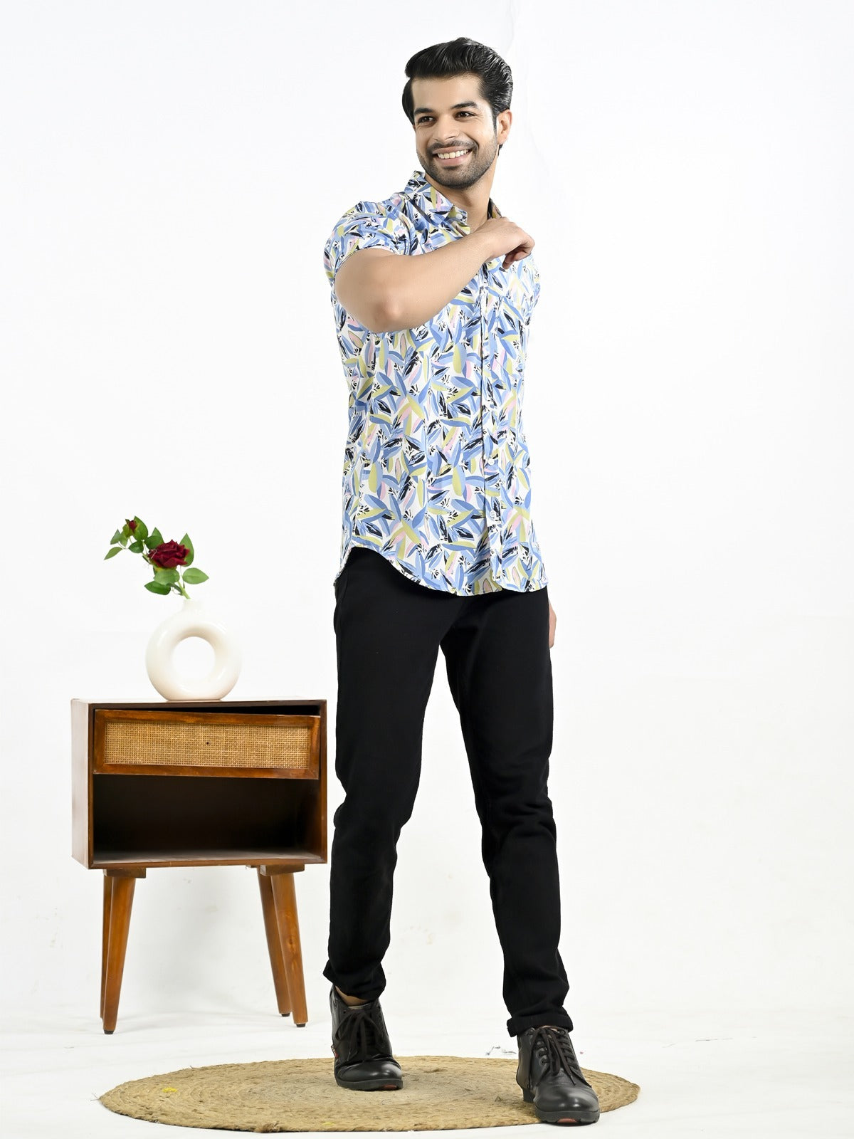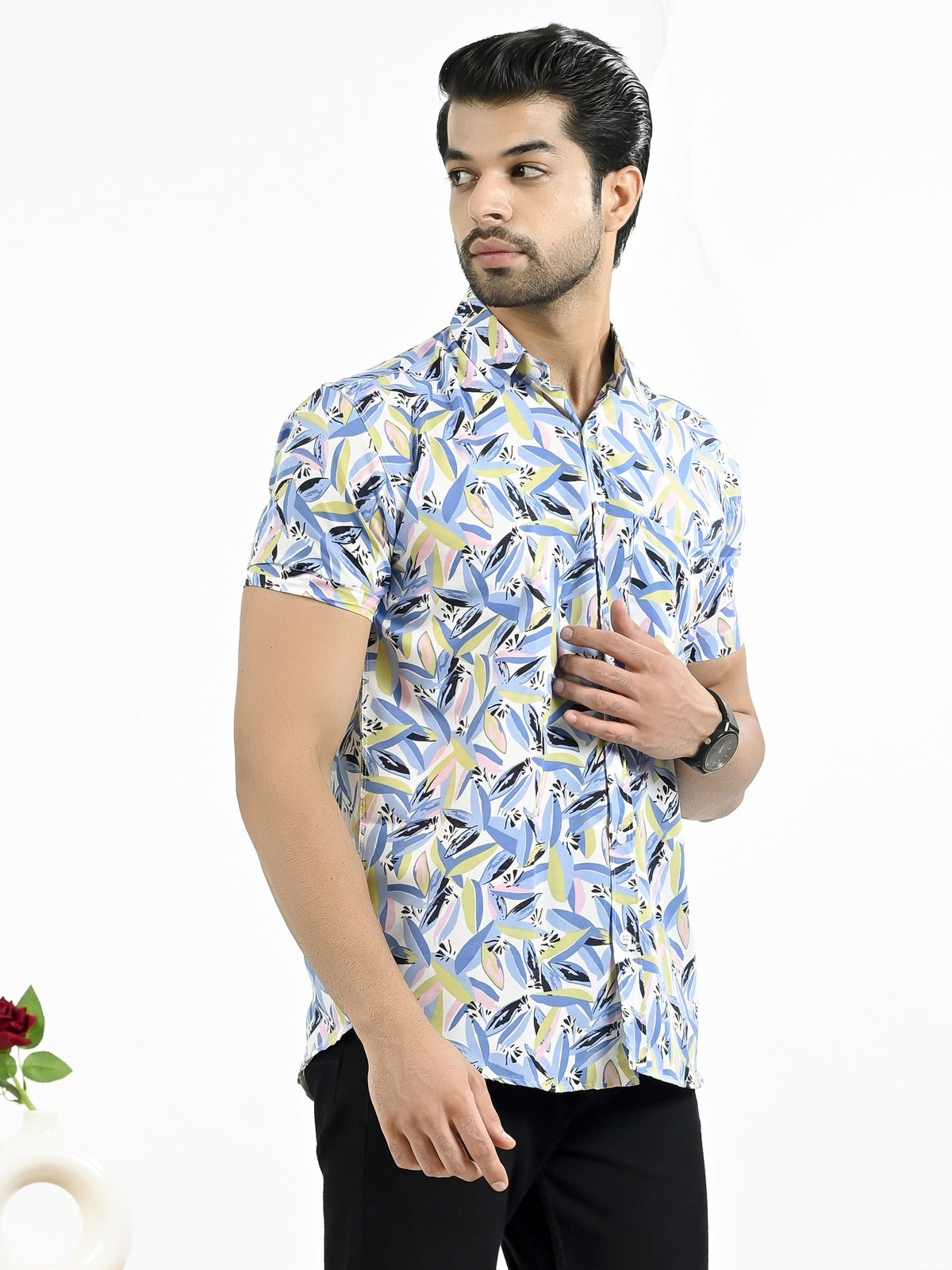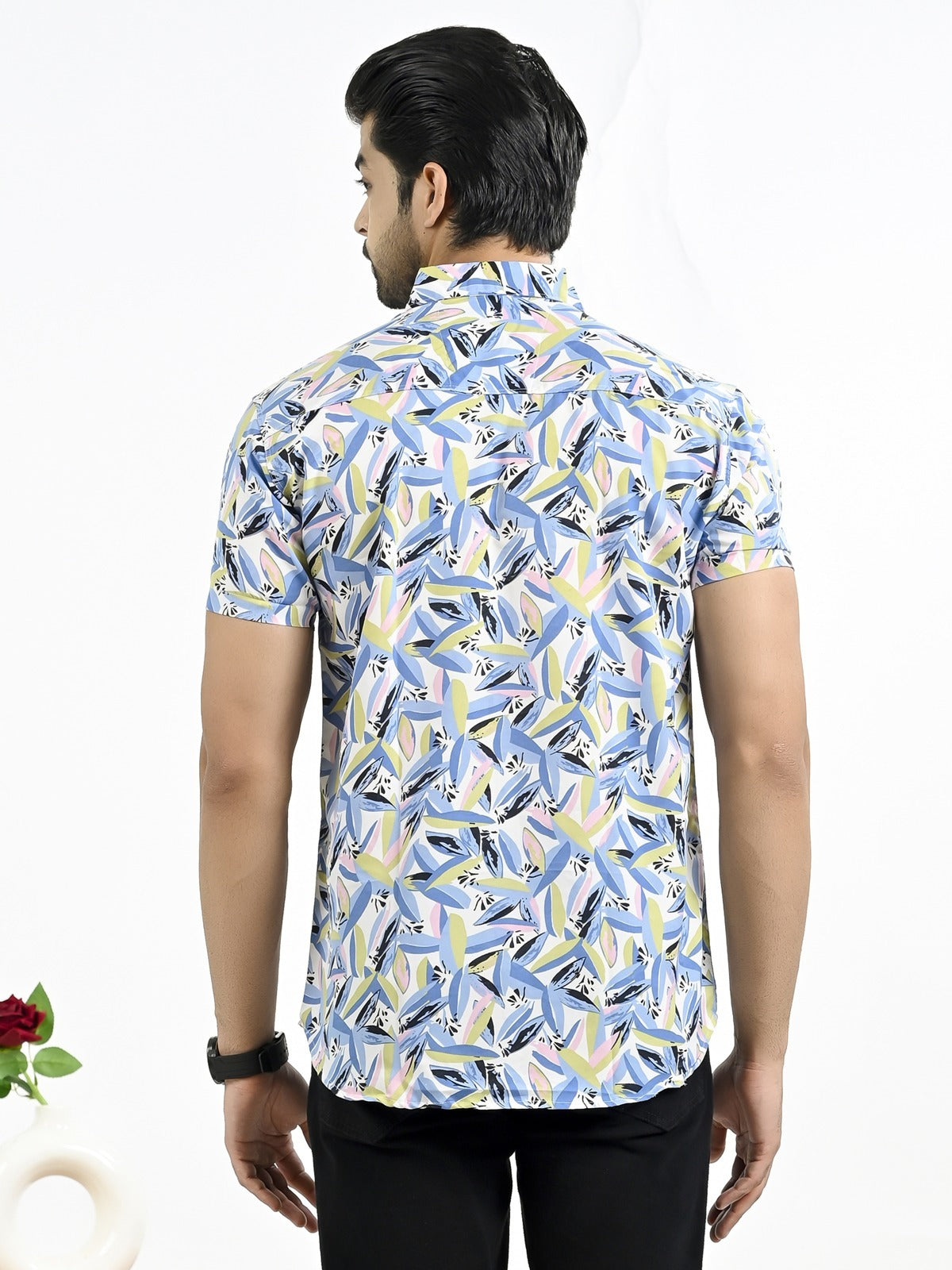The stylish men's half-sleeve crepe shirt with a floral print is an excellent fit to any outfit, whether it's casual or formal. With its soft and comfortable feel, this shirt's crepe fabric makes it ideal for every occasion. In addition to keeping you cool and comfortable, the half sleeves add a touch of elegance with their floral pattern. The spread collar and button closure of this large shirt guarantee an universal and elegant look. For a versatile look, pair it with your favorite jeans or pants. It looks great. For those who want to draw attention, this shirt is a must-have addition to any wardrobe.