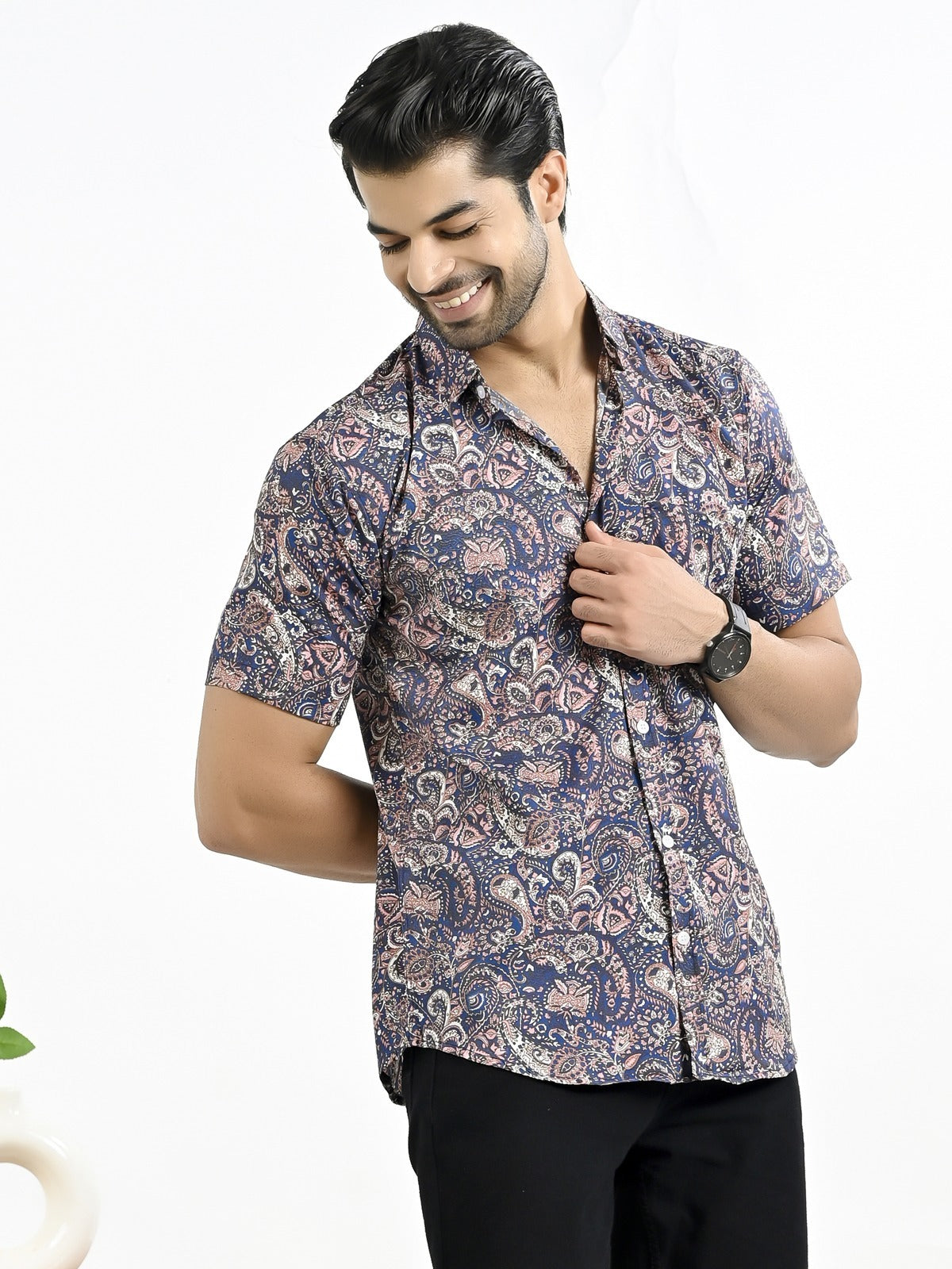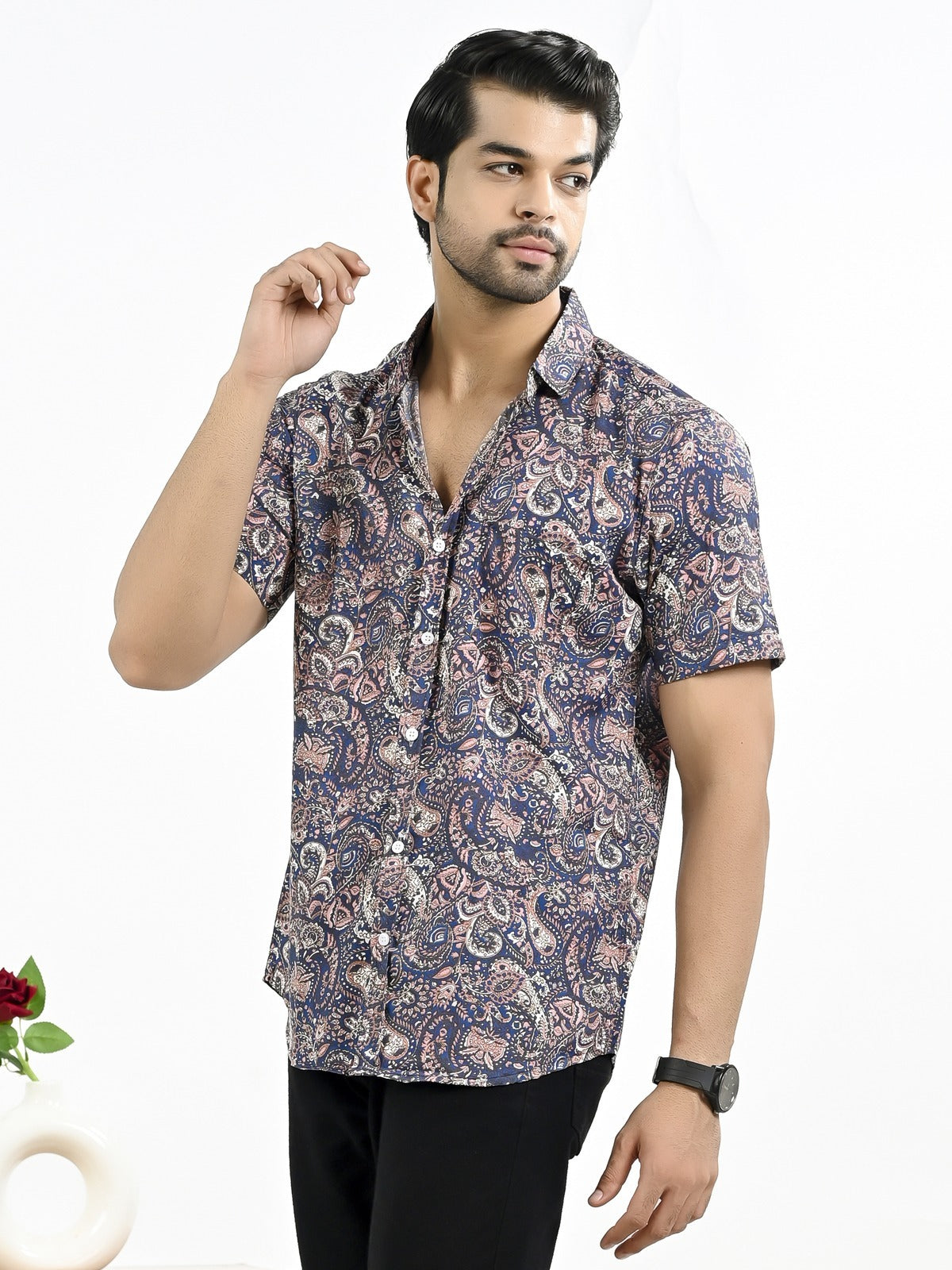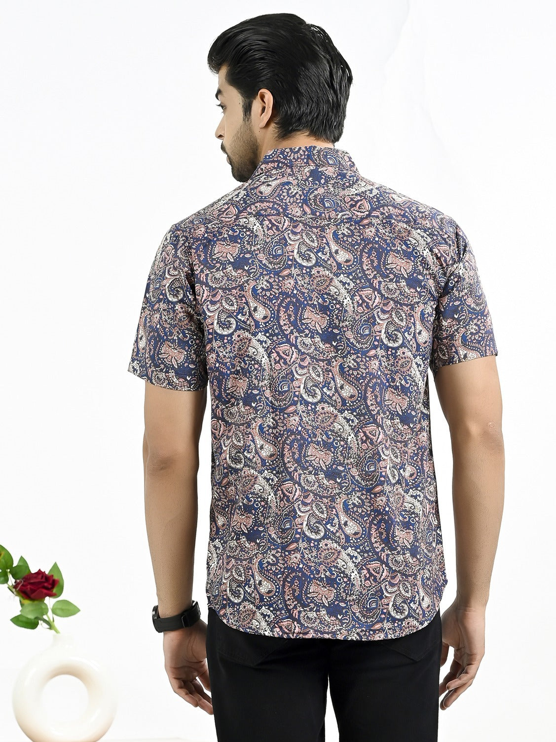 The stylish men's half-sleeve crepe shirt with a floral print is an excellent fit to any outfit, whether it's casual or formal. With its soft and comfortable feel, this shirt's crepe fabric makes it ideal for every occasion. In addition to keeping you cool and comfortable, the half sleeves add a touch of elegance with their floral pattern. The spread collar and button closure of this large shirt guarantee an universal and elegant look. For a versatile look, pair it with your favorite jeans or pants. It looks great. For those who want to draw attention, this shirt is a must-have addition to any wardrobe.