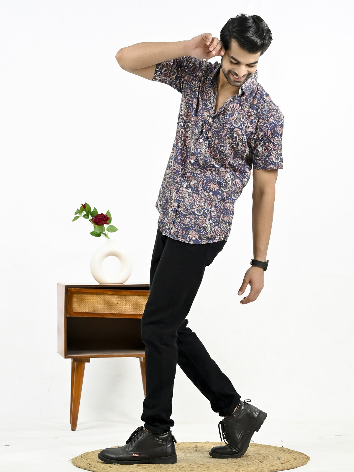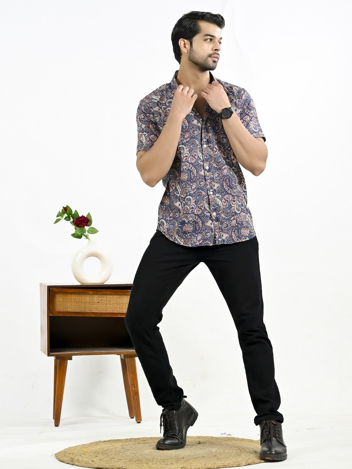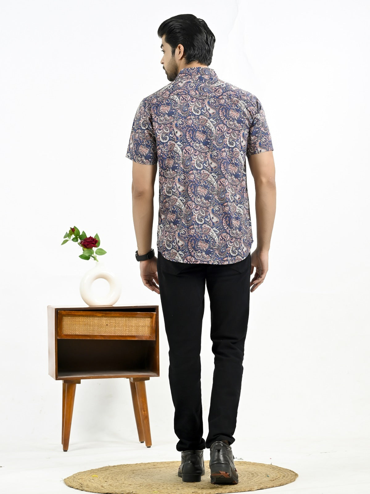 The stylish men's half-sleeve crepe shirt with a floral print is an excellent fit to any outfit, whether it's casual or formal. With its soft and comfortable feel, this shirt's crepe fabric makes it ideal for every occasion. In addition to keeping you cool and comfortable, the half sleeves add a touch of elegance with their floral pattern. The spread collar and button closure of this large shirt guarantee an universal and elegant look. For a versatile look, pair it with your favorite jeans or pants. It looks great. For those who want to draw attention, this shirt is a must-have addition to any wardrobe.