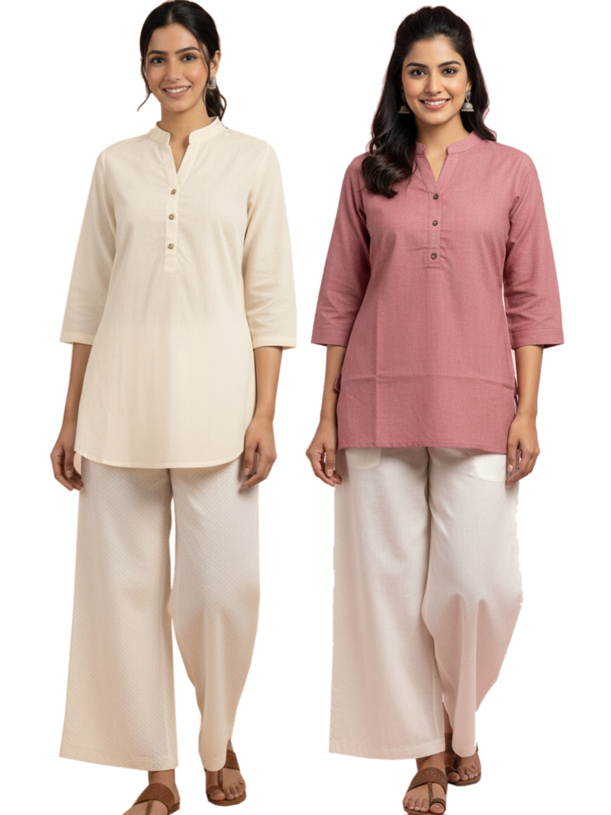 This Pack Of 2 Women's Solid Top Combo, is the ideal fusion of comfort and design, These will upgrade your wardrobe, made from a high-quality cotton that keeps you comfortable all day. Your outfit is made more sophisticated by the tasteful design. These adaptable tops is the perfect pick whether you're going to the office, on a casual trip, or to a weekend brunch. It radiates classic appeal and ups your fashion game, complete with a chinese/mandarin collar. The Women's Solid Top Combo can help you achieve modern elegance right away.