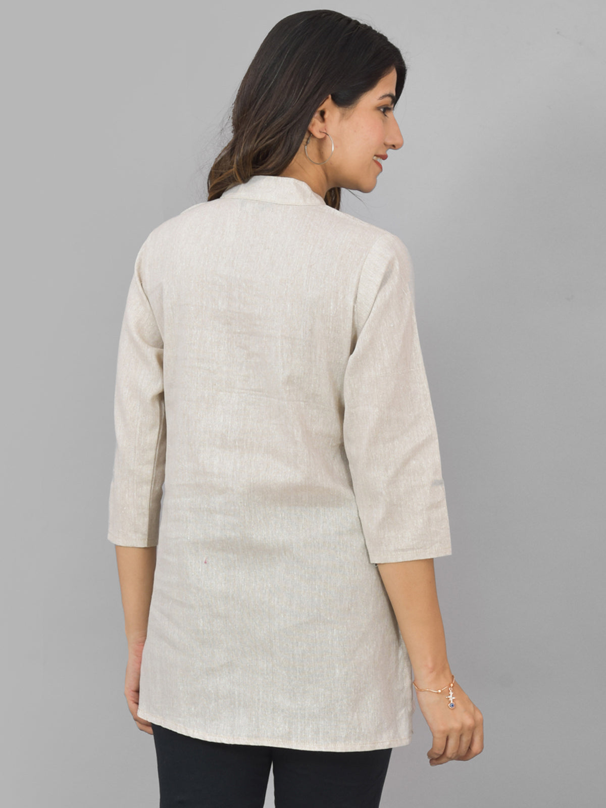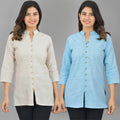 Pack Of 2 Womens Cream And Sky Blue Woven Design Handloom Cotton Frontslit Short Kurtis
