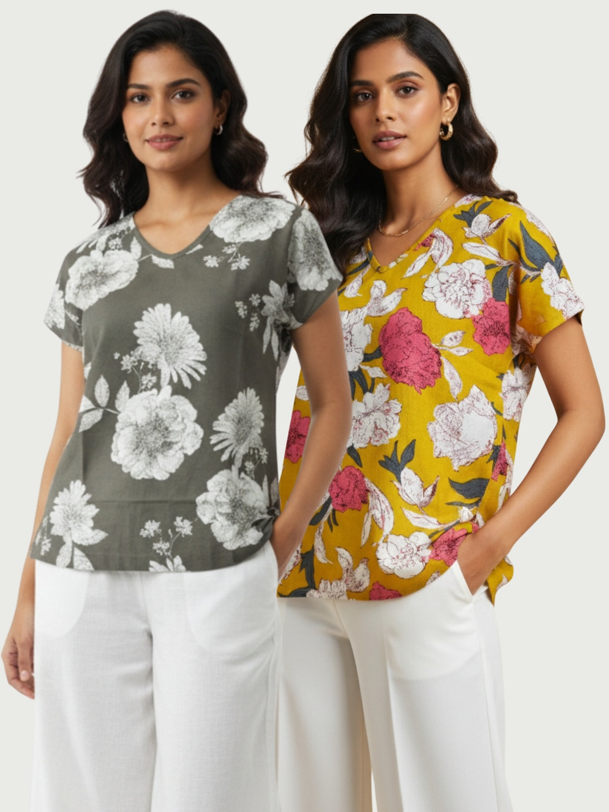 Pack Of 2 Womens Cream And Yellow Airy Linen Cotton Printed Tops