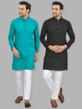 Mens Solid Cyan And Black Cotton Long Kurta Combo