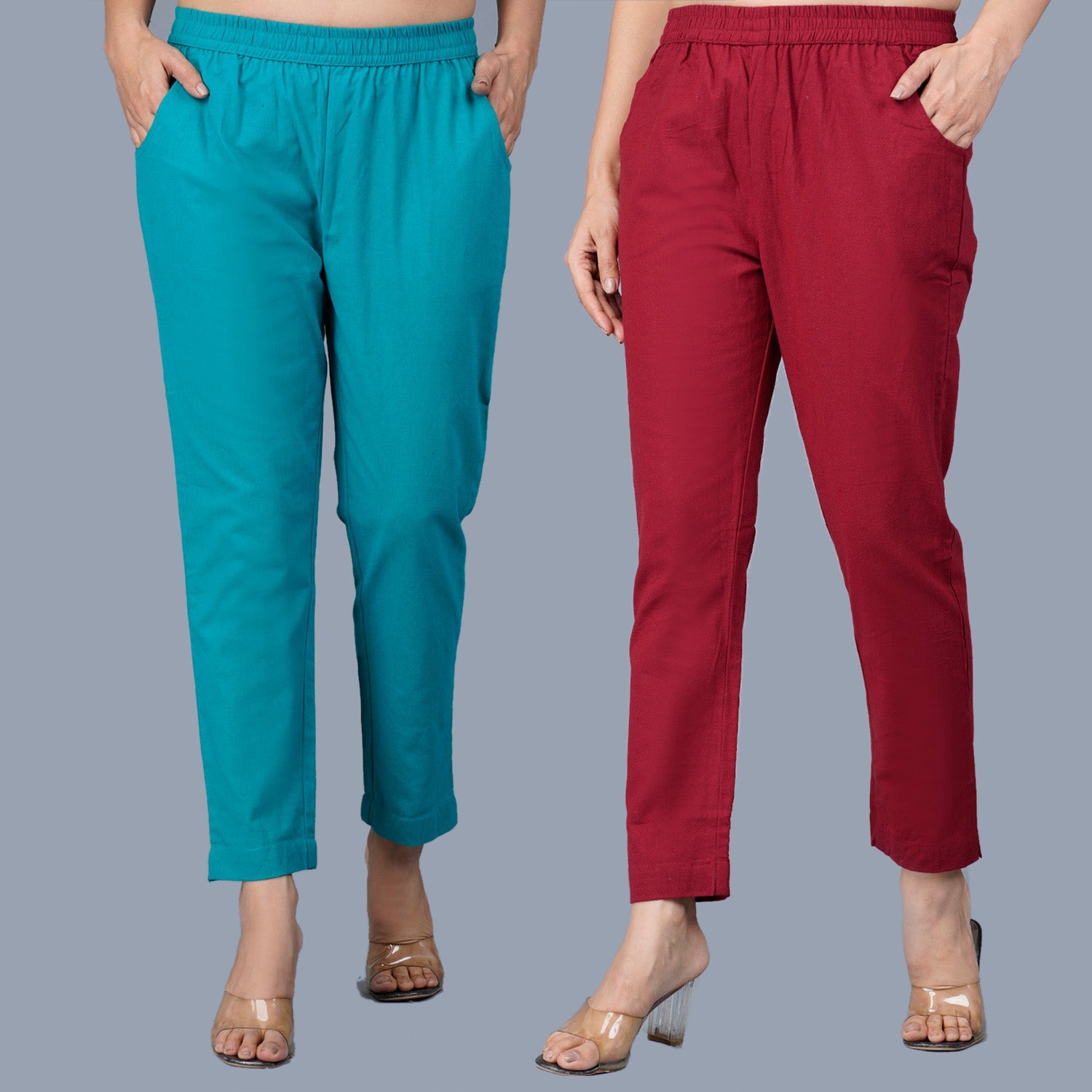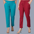 Pack Of 2 Womens Regular Fit Cyan And Maroon Fully Elastic Waistband Cotton Trouser