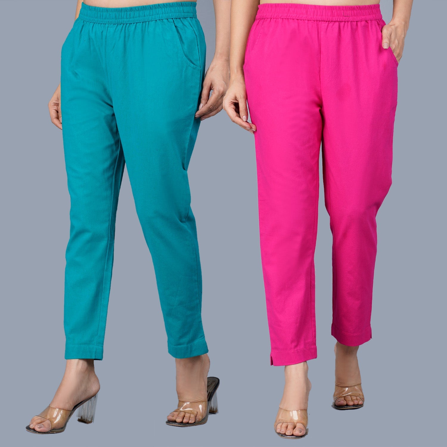 Pack Of 2 Womens Regular Fit Cyan And Rani Fully Elastic Waistband Cotton Trouser